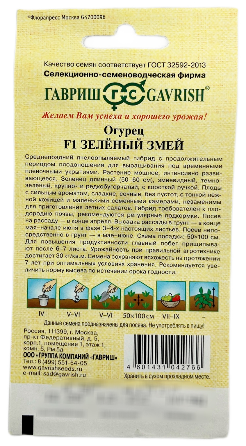 Огурец Зеленый Змей F1Среднепозний пчелоопыляемый гибрид с продоложительным периодом плодоношения для выращивания под временными пленочными укрытиями. Растение мощное, интенсивно развивающееся. Зеленец длинный (50-60 см), змеевидный, темно-зеленый, крупно-, редкобугорчатый, с короткой ручкой. Плоды с сильным ароматом, сладкие, сочные, без пустот, с тонкой нежной кожицей и маленькими семенными камерами, незаменимы для приготовления летних салатов. Сорт требователен к плодородию почвы, рекомендуются регулярные подкормки. Посев на рассаду — в конце апреля. Высадка рассады в грунт — в конце мая – начале июня в фазе 3-4-х настоящих листьев. Посев непосредственно в грунт – в мае – июне. Схема посадки: 50х100 см. Для повышения продуктивности главный побег прищипывают после 6-7 листа. Урожайность при правильной агротехнике достигает 30 кг/м2.