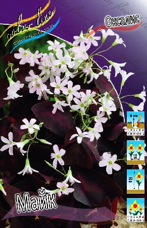 Оксалис Майк относится к группе многолетних луковичных цветов, семейству кисличных. Листья фиолетовые, тройчатые, содержат щавелевую кислоту, а так же незначительную часть витамина С - можно добавлять в чай. Цветки имеют розово-белый цвет. Цветение в мае - июне. Предпочитает богатую почву с нейтральной или слабокислой реакцией. Высаживают на хорошо освещенные, защищенные от ветра и дренированные участки. Размножают семенами, а также делением корневищ или клубней. Устойчиво к болезням и вредителям. Сфера использования - альпинарии, рокарии, каменистых садики, групповые посадки и бордюры.Характеристики