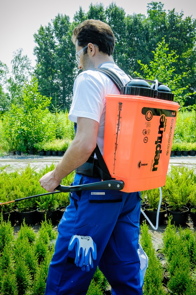 Ранцевый опрыскиватель. У опрыскивателей "НЕПТУН - 15" имеются клапан диапазонов 1 атм. / 3 атм., манометр, трех степенная система фильтрации жидкости, термическая изоляция со стороны спины. Имеется возможность применения аксессуаров, профессиональных сопел распылителя, произведенных известными в мире фирмами. К опрыскивателю прилагается комплект запчастей.Назначение: опрыскиватель предназначен для ручного орошения и опрыскивания.