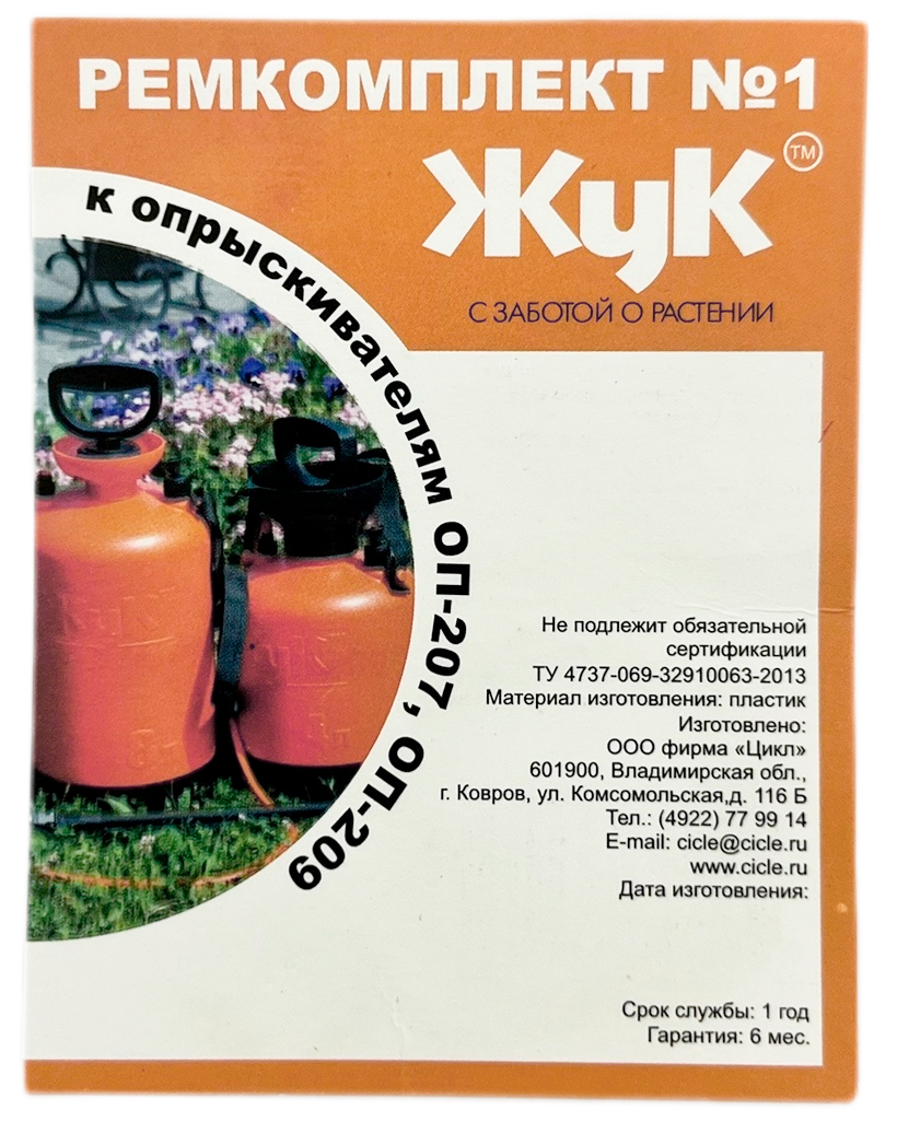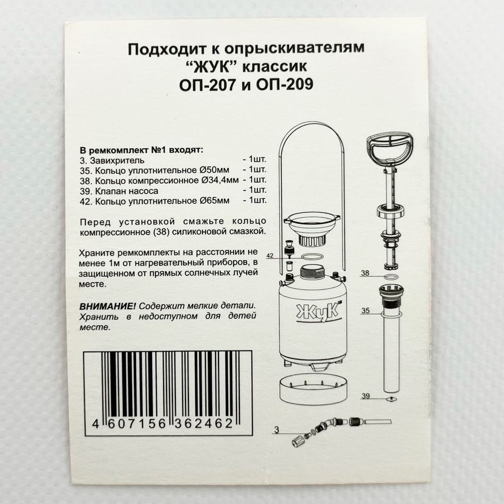 Ремкомплект №1 жук подходит к опрыскивателям ОП-207, ОП-209Комплект включает в себя необходимые любому владельцу опрыскивателя запасные части: завихритель, кольцо уплотнительное 50 мм, кольцо компрессионное 34,4 мм, клапан насоса, кольцо уплотнительное 65 мм.