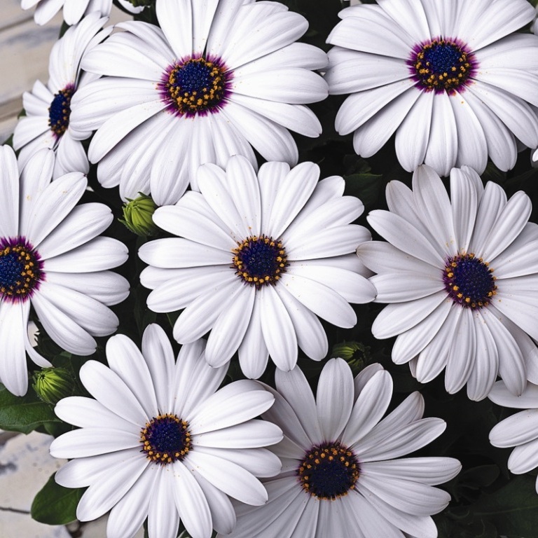 Многолетник 70-100 см высотой, выращиваемый как однолетник. Ромашковидные соцветия диаметром 4-5 см с белыми язычковыми цветками и синим центром, распускающиеся с июня до октября.Хорошо растет на прогреваемых солнечных участках, нуждается в рыхлой, плодородной почве, не теряют декоративности в непогоду. Семена высевают под стекло в марте-апреле в ящики с легким песчаным грунтом. Глубина заделки семян 0,5 см. Всходы появляются через 7-10 дней.