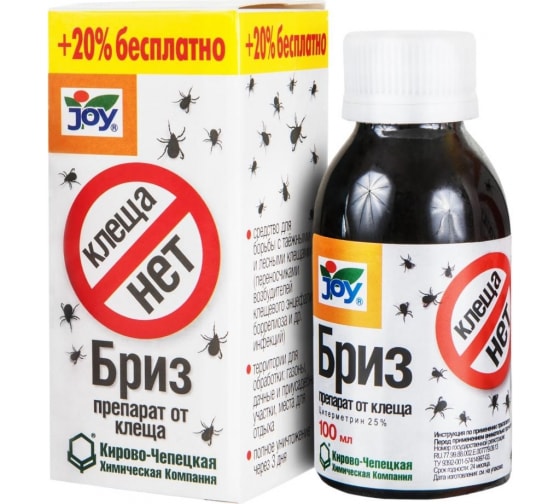 Клеща нет Бриз 100млПрепарат нового поколения для борьбы с клещом и его личинками. Эффективное средство для борьбы с таежными и лесными клещами, переносчиками возбудителей клещевого энцефалита, боррелиоза и других инфекций. Не вызывает привыкания у насекомых - вредителей. Действует в жару. Длительный период защитного действия. Не смывается дождем и при поливе, удерживается в растениях более 14 дней. Достаточно одной обработки.