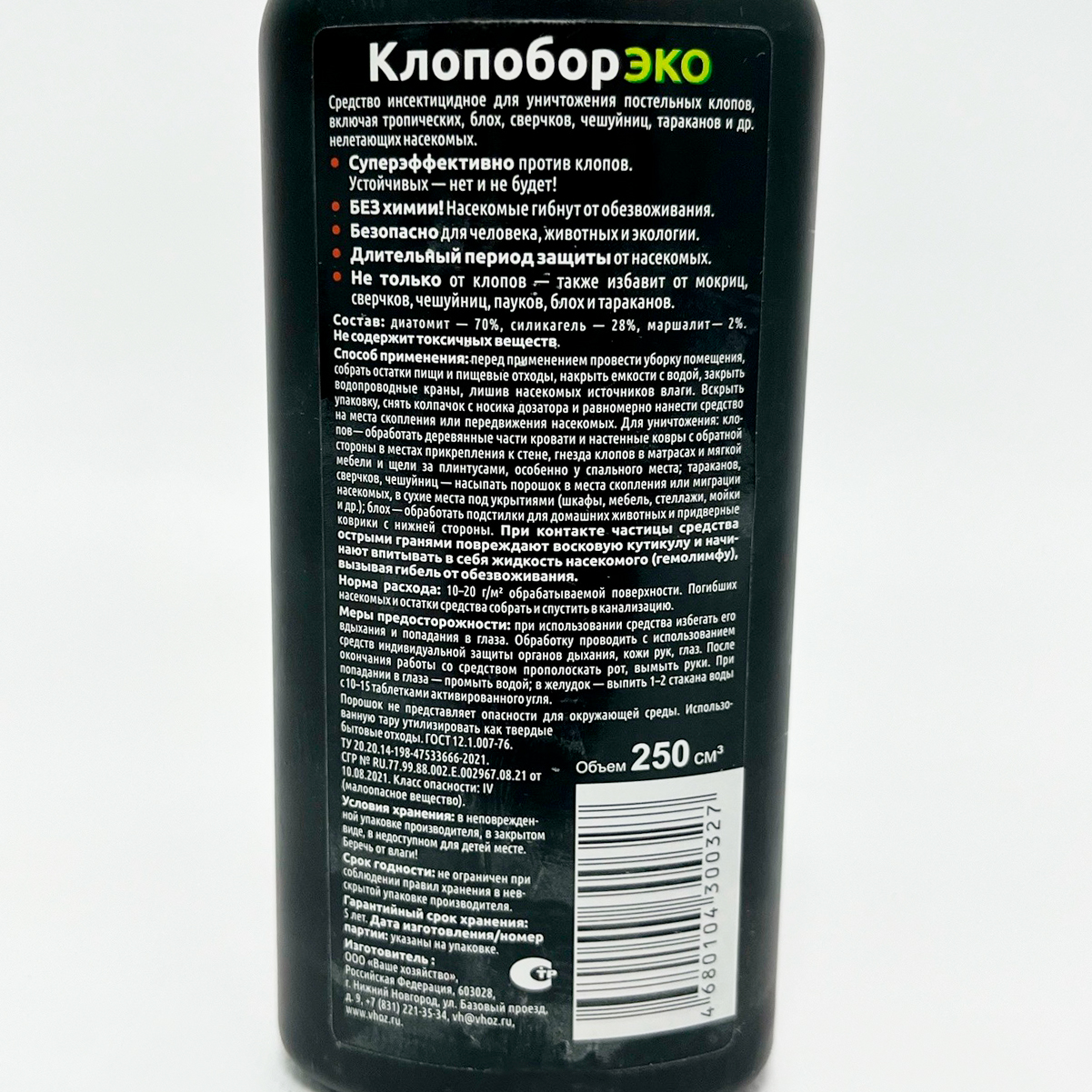 Клопобор ЭКО без запаха, без химииСостав: диатомит 70%, силикагель 28%, маршалит2%.