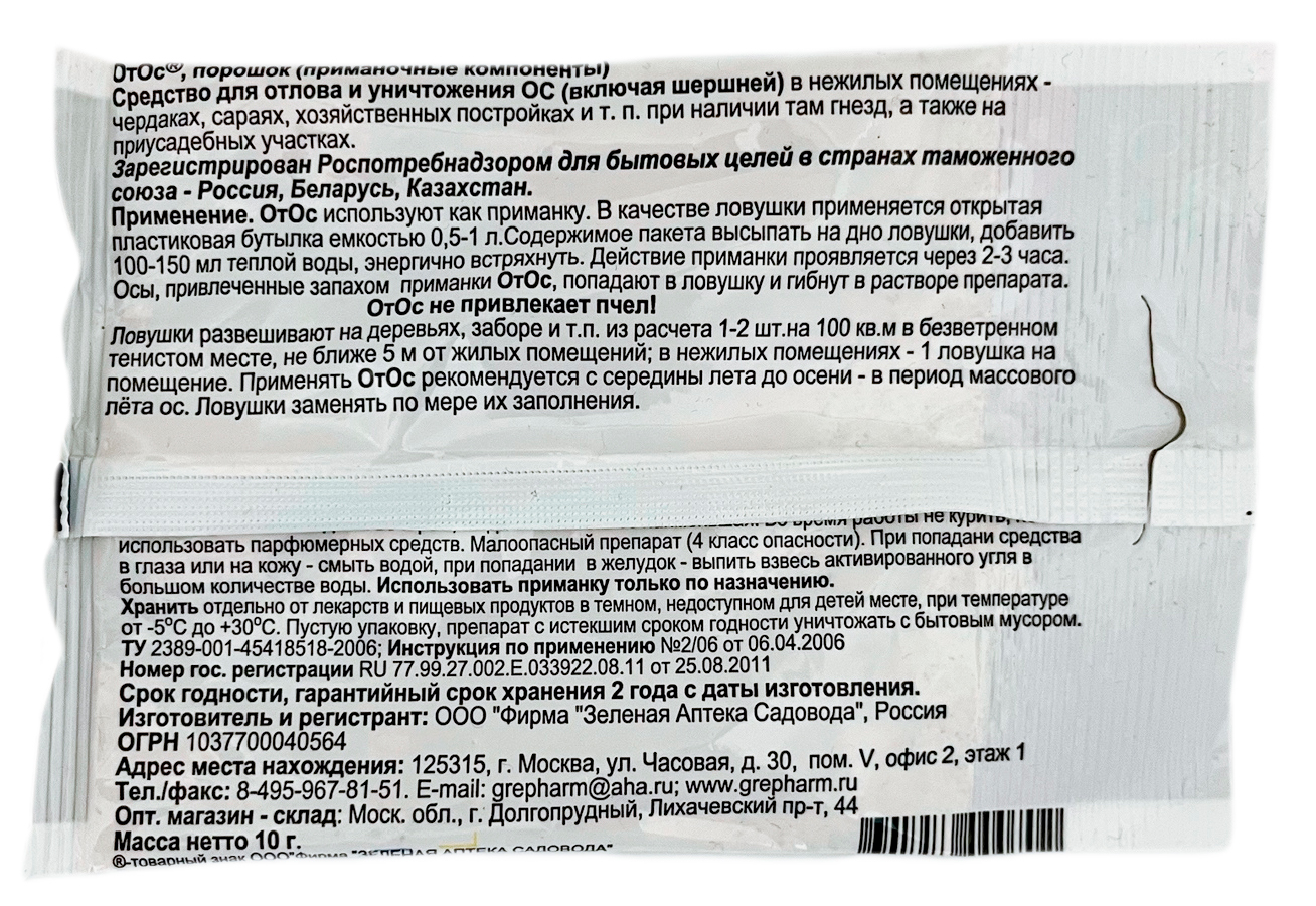 Средство «Отос» представляет собой приманку для привлечения ос и шершней. Препарат обладает избирательным действием и не влияет на пчел и других полезных насекомых. «Отос» — это средство, которое не содержит токсичных для человека веществ. Для изготовления ловушки достаточно насыпать порошок в пластиковую бутылку и развести его водой. Средство предназначено для использования в нежилых помещениях и на садово-огородном участке.