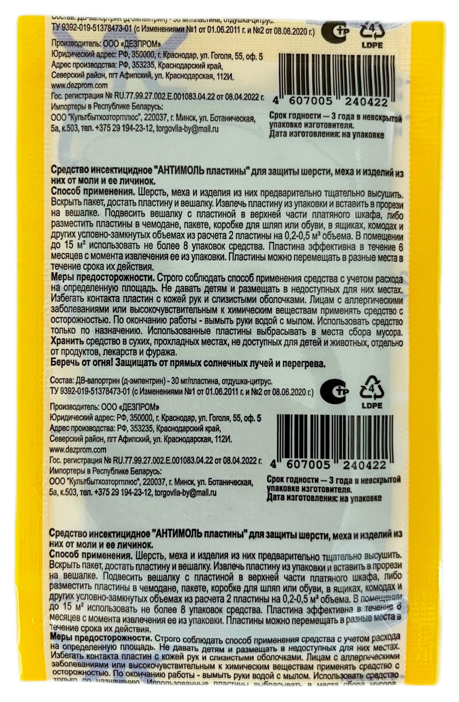 АнтиМоль 2 пластины + вешалка. Для защиты от моли и кожееда.Активное вещество не только отпугивает, но и уничтожает взрослых особей и личинок моли.