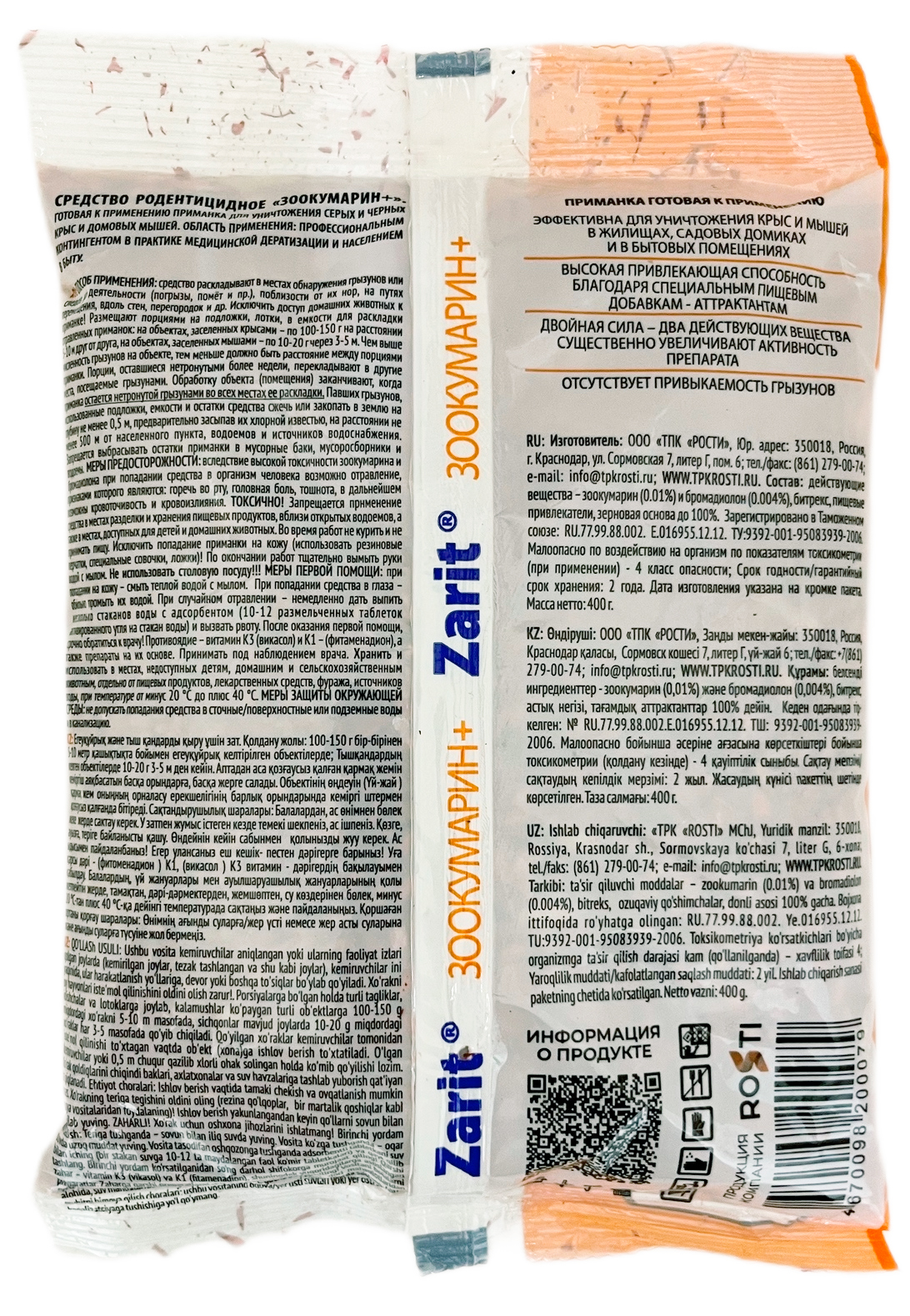 Средство от крыс и мышей Zarit зерно ИСТРЕБИТЕЛЬ ЗООКУМАРИН+ 400гОбладает высокой привлекающей способностью для крыс и мышей. Активно даже в отношении грызунов, не чувствительных к другим ядам. Вызывает удушье мышей и крыс - гибель наступает, как правило, на открытых местах, а не в норах.