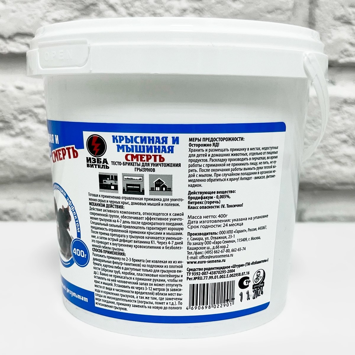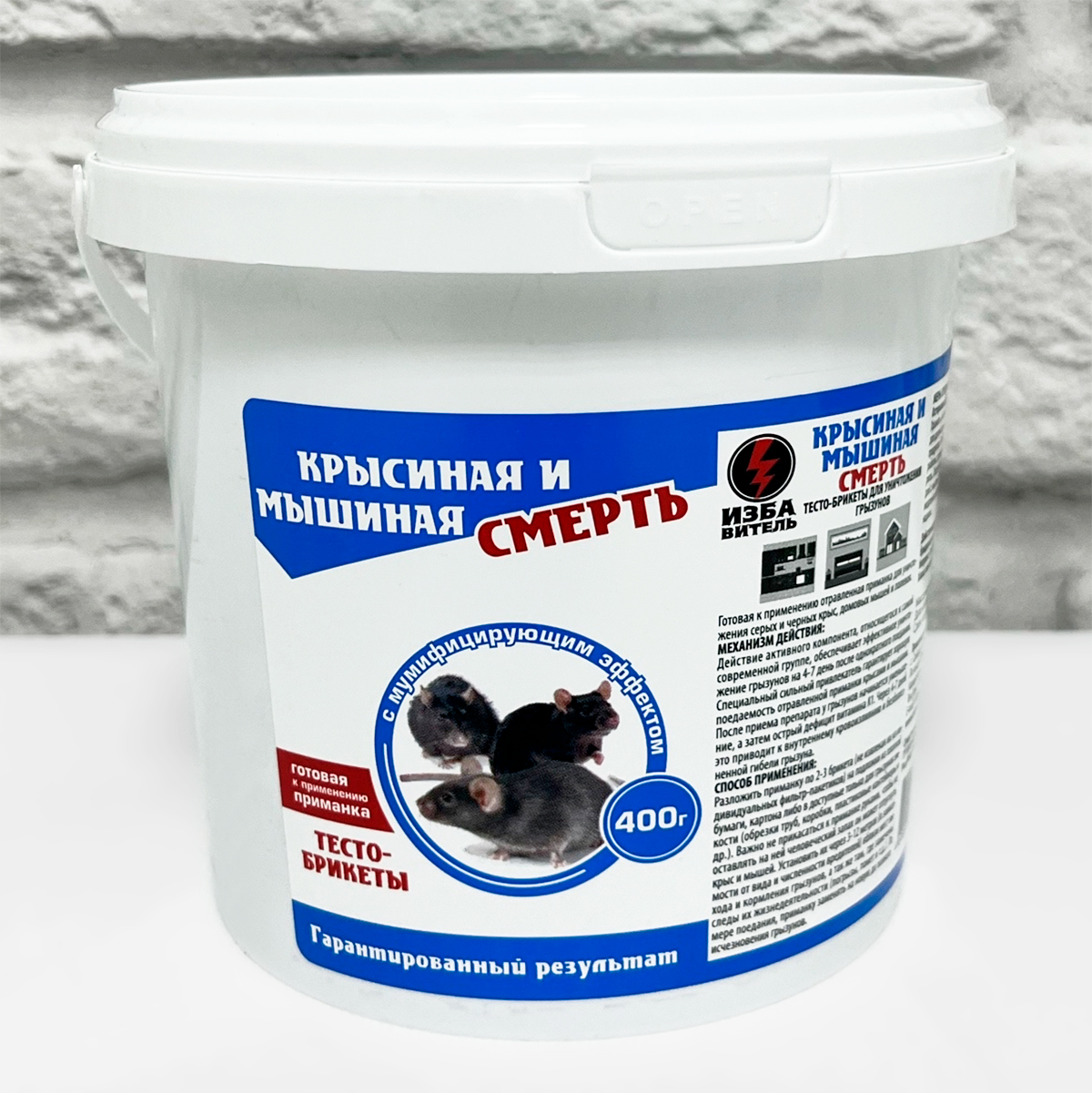 ИЗБАВИТЕЛЬ Крысиная и мышиная смерть 400г тесто-брикетыГарантированный результат. Готовая приманка с мумифицирующим эффектом.