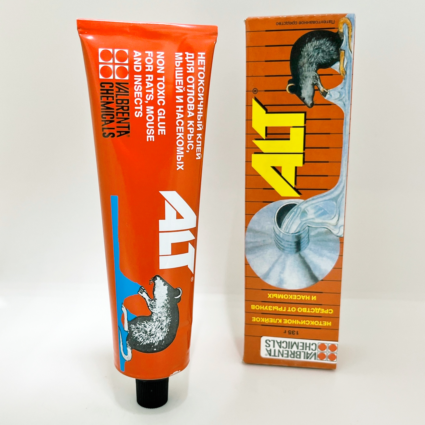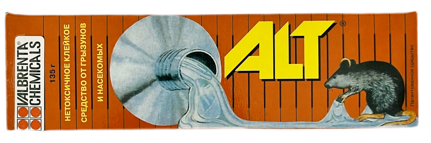 АЛТ-клей 135гр нетоксичное клейкое средство от грызунов и насекомых.Клей используется для отлова грызунов и насекомых на открытой территории, внутри жилых помещений, предприятий общественного питания, детских учреждений и на продуктовых складах, где запрещено применение отравленных приманок. Клеевая масса наносится на плотную подложку, приклеивающийся к ней грызун или насекомое погибает за два-три часа от отсутствия влаги и движения. Клей ALT не содержит токсичных веществ, экологически чистый, не имеет цвета, не растекается, влагостойкий, не поддается атмосферному воздействию. Можно использовать в помещениях и на открытой местности. Безопасен при вдыхании и не вызывает раздражения при случайном попадании на кожу. Имеет специфическую прозрачную липкую консистенцию, не теряющую своих свойств со временем. Клей ALT не содержит токсичных веществ, экологически чистый, не растекается, влагостойкий, не поддается атмосферному воздействию.