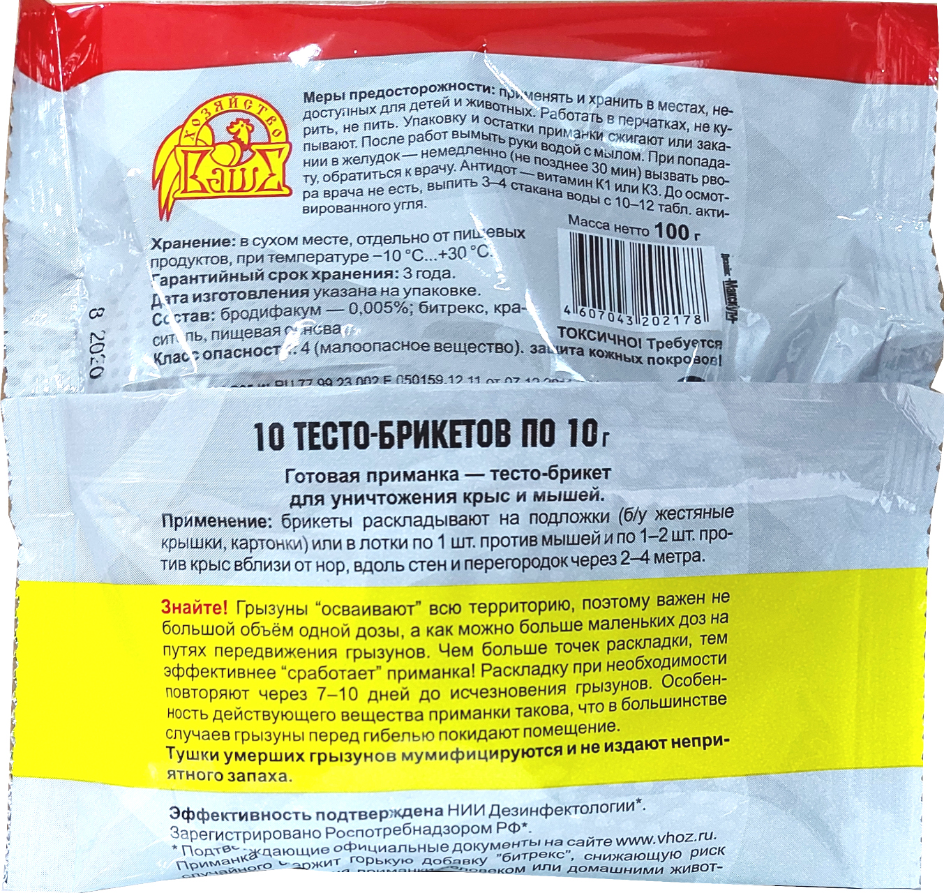 Применение: брикеты раскладывают на подложки (б/у жестяные крышки, картонки) или в лотки по 1 шт. против мышей и по 1–2 шт против крыс вблизи от нор, вдоль стен и перегородок через 2–4 метра.