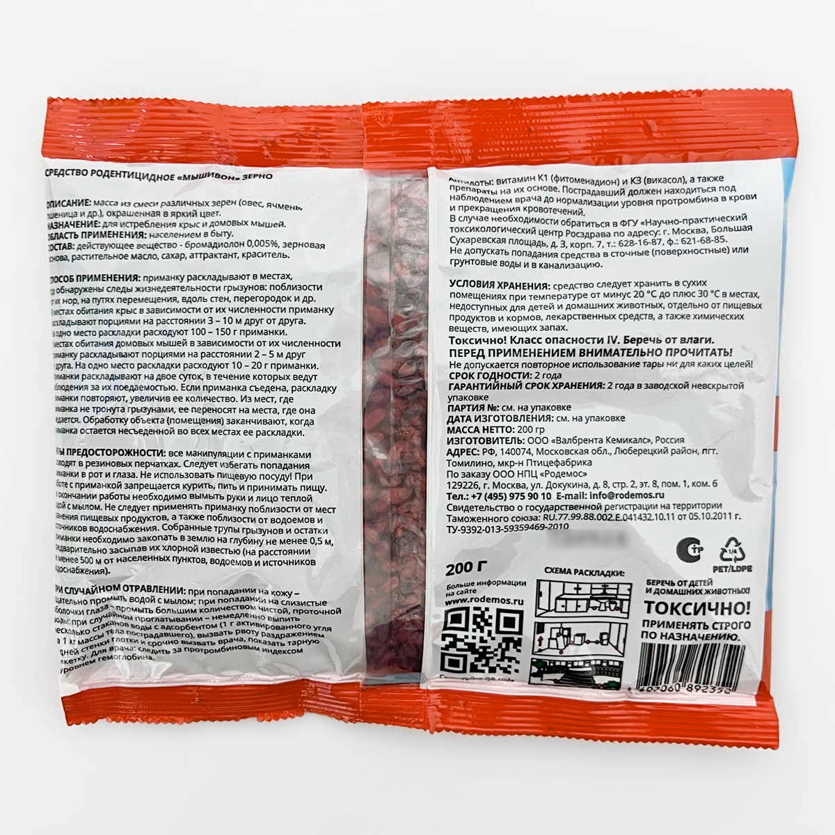 Состав: бромадиолон 0,005%, зерновая основа, растительное масло, сахар, аттрактант, краситель.