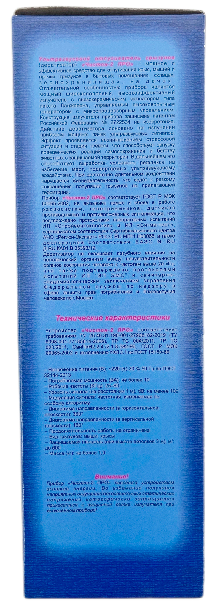 CHISTON 2 PROДератизатор «Чистон-2ПРО» - это мощное и эффективное средство для отпугивания крыс, мышей и прочих грызунов в бытовых помещениях, складах, дачах, зернохранилищах. Не оставит шансов вредителям на защищаемой территории. Единственный в мире прибор с реально круговой диаграммой направленности.