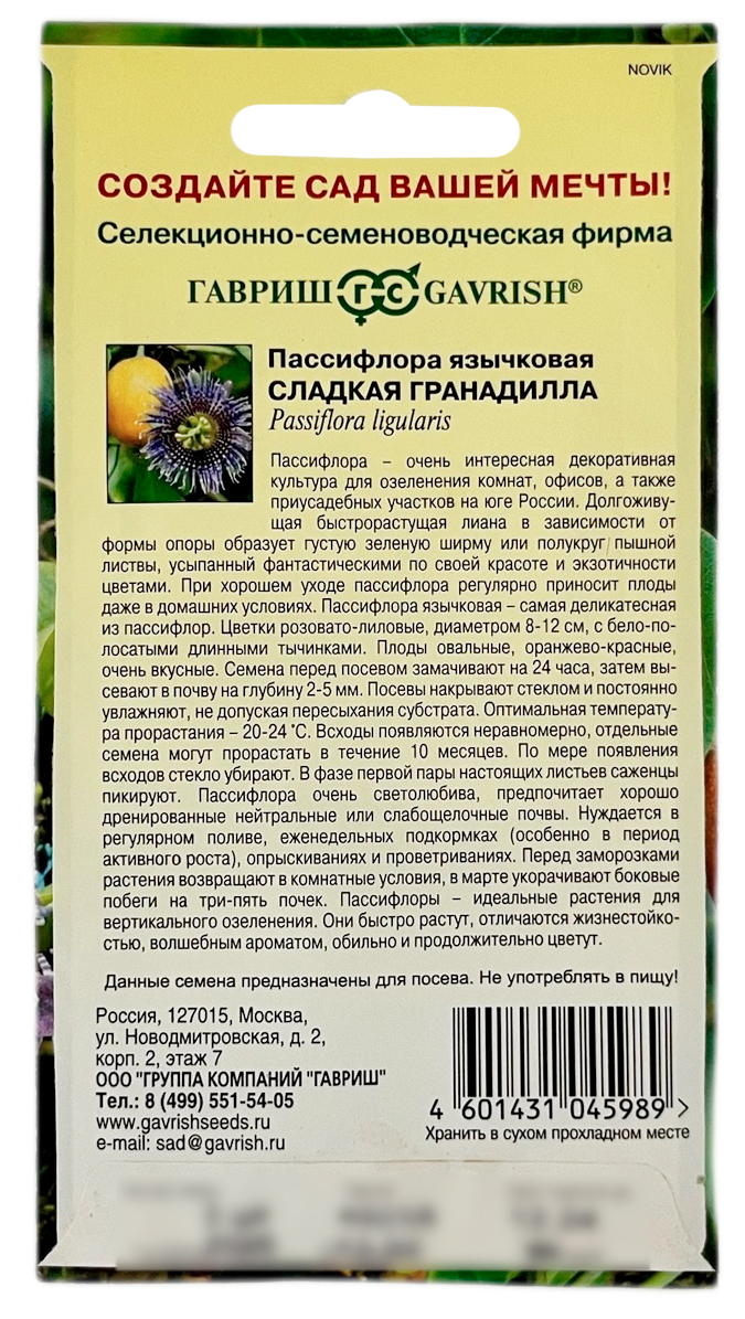 Пассифлора язычковая Сладкая гранадилла ГАВРИШПассифлора — очень интересная декоративная культура для озеленения комнат, офисов, а также приусадебных участков на юге России. Долгоживущая быстрорастущая лиана в зависимости от формы опоры образуют густую зеленую ширму или полукруг пышной листвы, усыпанный фантастическими по своей красоте и экзотичности цветами. При хорошем уходе пассифлора регулярно приносит плоды даже в домашних условиях. Пассифлора язычковая — самая деликатесная из пассифлор. Цветки розовато-лиловые, диаметром 8-12 см с бело полосатыми длинными тычинками. Плоды овальные, оранжево-красные, очень вкусные. Семена перед посевом замачивают на 24 часа, затем высевают в почву на глубину 2-5 мм. Посевы накрывают стеклом и постоянно увлажняют, не допуская пересыхания субстрата. Оптимальная температура прорастания —20-24°С. Всходы появляются неравномерно, отдельные семена могут прорастать в течение 10 месяцев. По мере появления всходов стекло убирают. В фазе первой пары настоящих листьев саженцы пикируют. Пассифлора очень светолюбива, предпочитает хорошо дренированные, нейтральные или слабощелочные почвы. Нуждается в регулярном поливе, еженедельных подкормах (особенно в период активного роста), опрыскиваниях и проветриваниях. Перед заморозками растения возвращают в комнатные условия; в марте укорачивают боковые побеги на три—пять почек. Пассифлоры — идеальные растения для вертикального озеленения. Они быстро растут, отличаются жизнестойкостью, волшебным ароматом, обильно и продолжительно цветут.