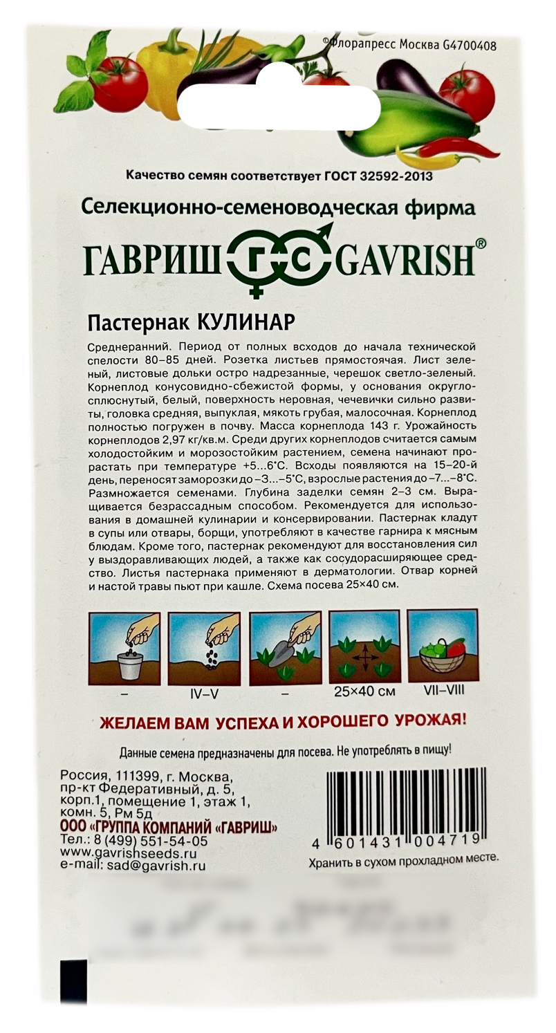 Пастернак КУЛИНАР ГАВРИШСреднеранний. Период от полных всходов до начала технической спелости 80-85 дней. Розетка листьев прямостоячая. Лист зеленый, листовые дольки остро надрезанные, черешок светло-зеленый. Корнеплод конусовидно-сбежистой формы, у основания округло-сплюснутый, белый, поверхность неровная, чечевички сильно развиты, головка средняя, выпуклая, мякоть грубая, малосочная. Корнеплод полностью погружен в почву. Масса корнеплода 143 г. Урожайность корнеплодов 2,97 кг/м2. Среди других корнеплодов считается самым холодостойким и морозостойким растением, семена начинают прорастать при температуре 5-6 °C. Всходы появляются на 15-20-й день, переносят заморозки до -З... -5 °C, взрослые растения до -7...-8 °C. Размножается семенами. Глубина заделки семян 2-3 см. Выращивается безрассадным способом. Рекомендуется для использования в домашней кулинарии и консервировании. Пастернак кладут в супы или отвары, борщи, употребляют в качестве гарнира к мясным блюдам.
