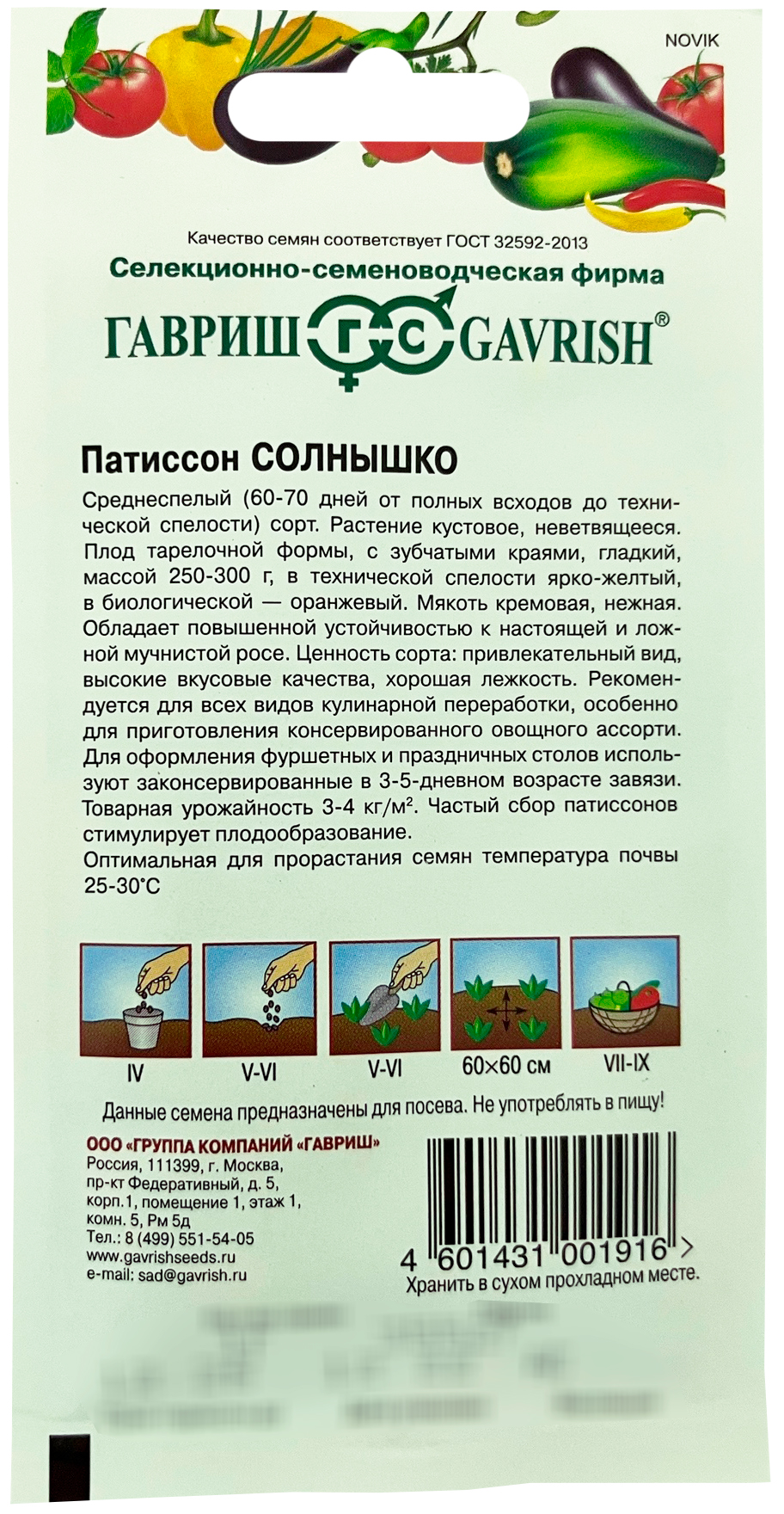 Патиссон Солнышко ГАВРИШСреднеспелый (60-70 дней от полных всходов до технической спелости) сорт. Растение кустовое, не ветвящееся. Плод тарелочной формы, с зубчатыми краями, гладкий, массой 250-300 г, в технической спелости ярко-желтый, в биологической – оранжевый. Мякоть кремовая. Рекомендуется для садово-огородных участков, приусадебных фермерских хозяйств, для консервирования и домашней кулинарии. Посев на рассаду - в апреле, высадка в грунт в мае – июне. Посев непосредственно в грунт в конце мая – июне. Хорошо отзывается на внесение органических удобрений. Схема посадки 60x60 см. Товарная урожайность 3-4 кг/м2 .