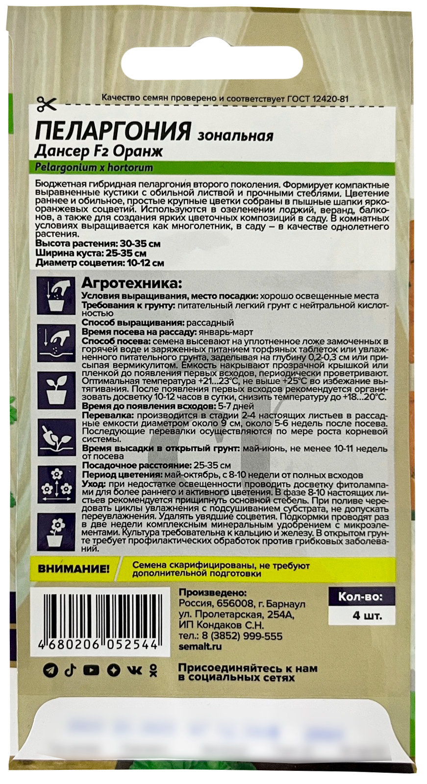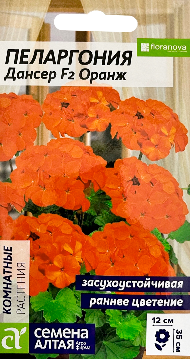 ПЕЛАРГОНИЯ ДАНСЕР F2 ОРАНЖ ЗОНАЛЬНАЯБюджетная гибридная пеларгония второго поколения. Формирует компактные выравненные кустики с обильной листвой и прочными стеблями. Цветение раннее и обильное, простые крупные цветки собраны в пышные шапки ярко-оранжевых соцветий. Используются в озеленении лоджий, веранд, балконов, а также для создания ярких цветочных композиций в саду. В комнатных условиях выращивается как многолетник, в саду – в качестве однолетнего растения.