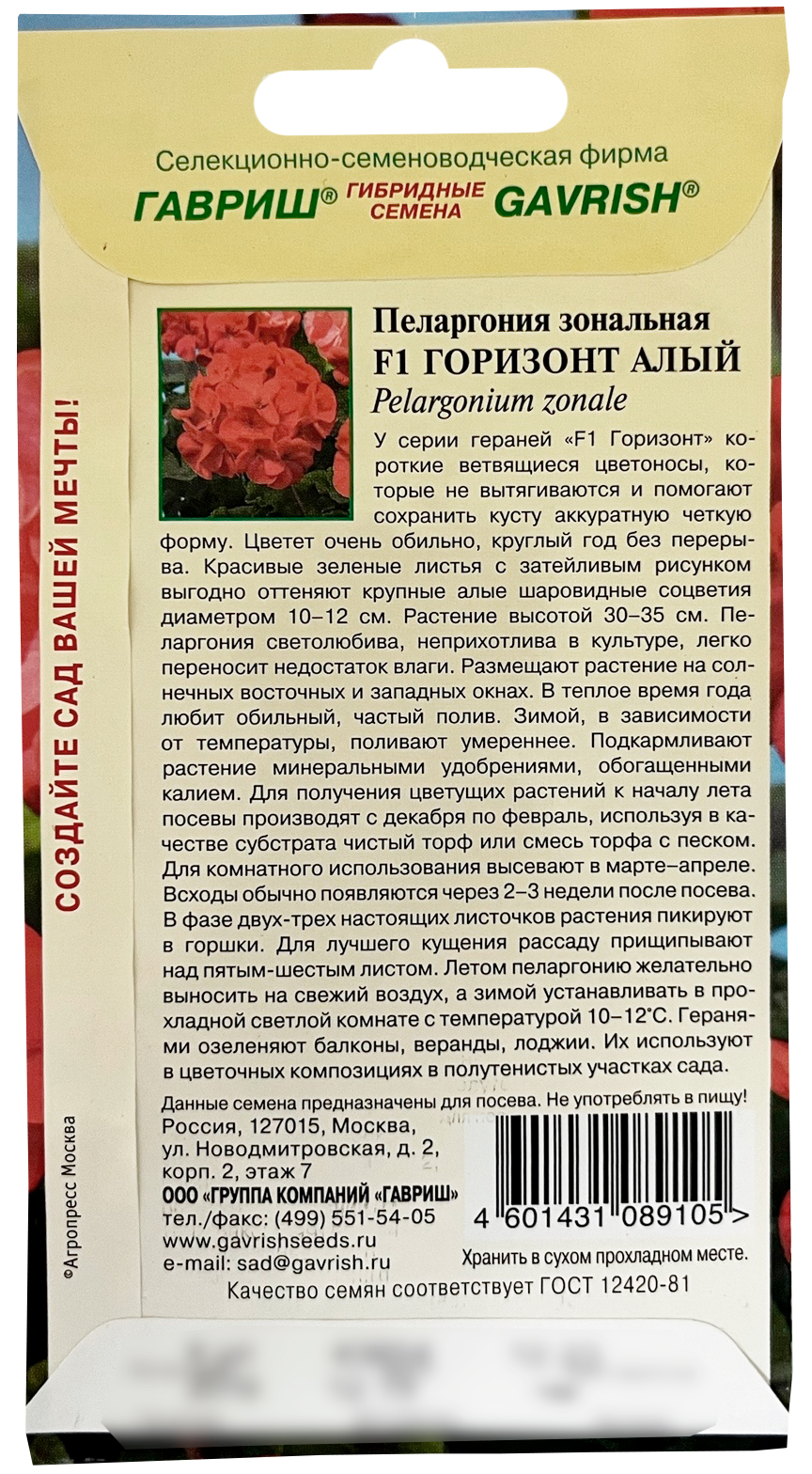 Пеларгония зональная Горизонт алый F1У серии гераней «F1 Горизонт» короткие ветвящиеся цветоносы, которые не вытягиваются и помогают сохранить кусту аккуратную четкую форму. Цветет очень обильно, круглый год без перерыва. Красивые зеленые листья с затейливым рисунком выгодно оттеняют крупные алые шаровидные соцветия диаметром 10-12 см. Растение высотой 30-35 см. Пеларгония светолюбива, неприхотлива в культуре, легко переносит недостаток влаги. Размещают растение на солнечных восточных и западных окнах. В теплое время года любит обильный, частый полив. Зимой, в зависимости от температуры, поливают умереннее. Подкармливают растение минеральными удобрениями, обогащенными калием. Для получения цветущих растений к началу лета посевы производят с декабря по февраль, используя в качестве субстрата чистый торф или смесь торфа с песком. Для комнатного использования высевают в марте-апреле. Всходы обычно появляются через 2-3 недели после посева. В фазе двух-трех настоящих листочков растения пикируют в горшки. Для лучшего кущения рассаду прищипывают над пятым - шестым листом. Летом пеларгонию желательно выносить на свежий воздух, а зимой устанавливать в прохладной светлой комнате с температурой 10-12 °С. Геранями озеленяют балконы, веранды, лоджии. Их используют в цветочных композициях в полутенистых участках сада.