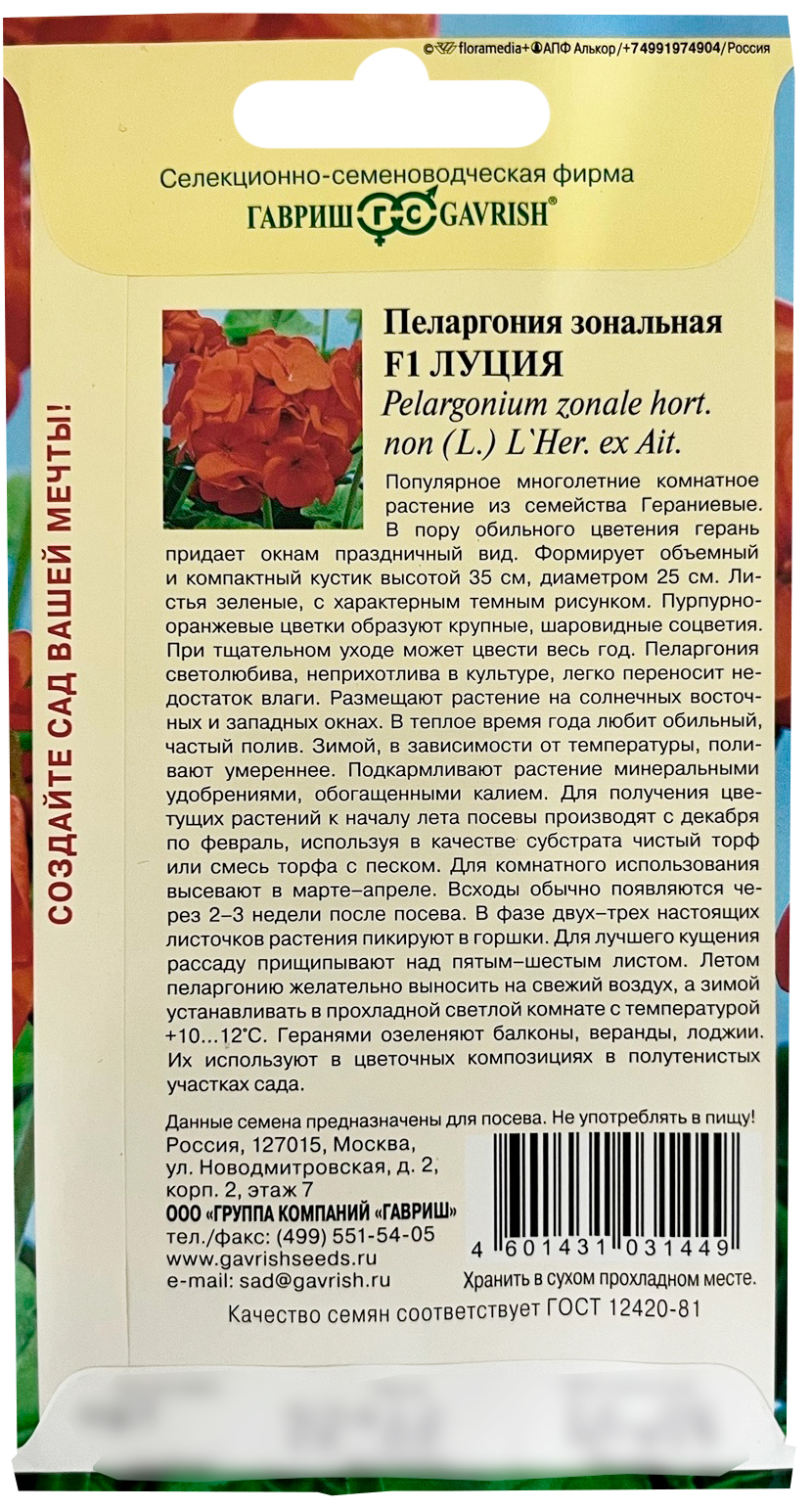 Пеларгония зональная Луция F1Популярное многолетние комнатное растение из семейства Гераниевые. В пору обильного цветения герань придает окнам праздничный вид. Формирует объемный и компактный кустик высотой 35 см, диаметром 25 см. Листья зеленые, с характерным темным рисунком. Цветки оранжевого цвета образуют крупные, шаровидные соцветия. При тщательном уходе может цвести весь год. Пеларгония светолюбива, неприхотлива в культуре, легко переносит недостаток влаги. Размещают растение на солнечных восточных и западных окнах. В теплое время года любит обильный, частый полив. Зимой, в зависимости от температуры, поливают умереннее. Подкармливают растение минеральными удобрениями, обогащенными калием. Для получения цветущих растений к началу лета посевы производят с декабря по февраль, используя в качестве субстрата чистый торф или смесь торфа с песком. Для комнатного использования высевают в марте-апреле. Всходы обычно появляются через 2-3 недели после посева. В фазе двух-трех настоящих листочков растения пикируют в горшки. Для лучшего кущения рассаду прищипывают над пятым - шестым листом. Летом пеларгонию желательно выносить на свежий воздух, а зимой устанавливать в прохладной светлой комнате с температурой 10-12 °C. Геранями озеленяют балконы, веранды, лоджии. Их используют в цветочных композициях в полутенистых участках сада.