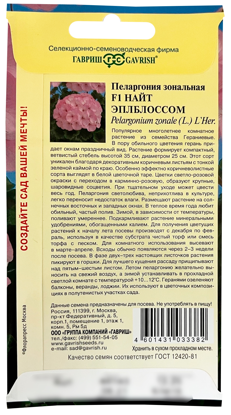 Пеларгония зональная Найт Эплблоссом F1Популярное многолетнее комнатное растение из семейства Гераниевые. В пору обильного цветения герань придает окнам праздничный вид. Формирует объемный и компактный кустик высотой 35 см, диаметром 25 см. Этот сорт уникален благодаря декоративным коричневым листьям с тонкой зеленой каймой по краю. Особенно эффектно коричневолистные сорта выглядят в белой цветочной таре. Цветки светло-розовой окраски с переходом в карминно-розовую, образуют крупные, шаровидные соцветия. При тщательном уходе может цвести весь год. Пеларгония светолюбива, неприхотлива в культуре, легко переносит недостаток влаги. Размещают растение на солнечных восточных и западных окнах. В теплое время года любит обильный, частый полив. Зимой, в зависимости от температуры, поливают умереннее. Подкармливают растение минеральными удобрениями, обогащенными калием. Для получения цветущих растений к началу лета посевы производят с декабря по февраль, используя в качестве субстрата чистый торф или смесь торфа с песком. Для комнатного использования высевают в марте-апреле. Всходы обычно появляются через 2-3 недели после посева. В фазе двух-трех настоящих листочков растения пикируют в горшки. Для лучшего кущения рассаду прищипывают над пятым - шестым листом. Летом пеларгонию желательно выносить на свежий воздух, а зимой устанавливать в прохладной светлой комнате с температурой 10-12 °C. Геранями озеленяют балконы, веранды, лоджии. Их используют в цветочных композициях в полутенистых участках сада.