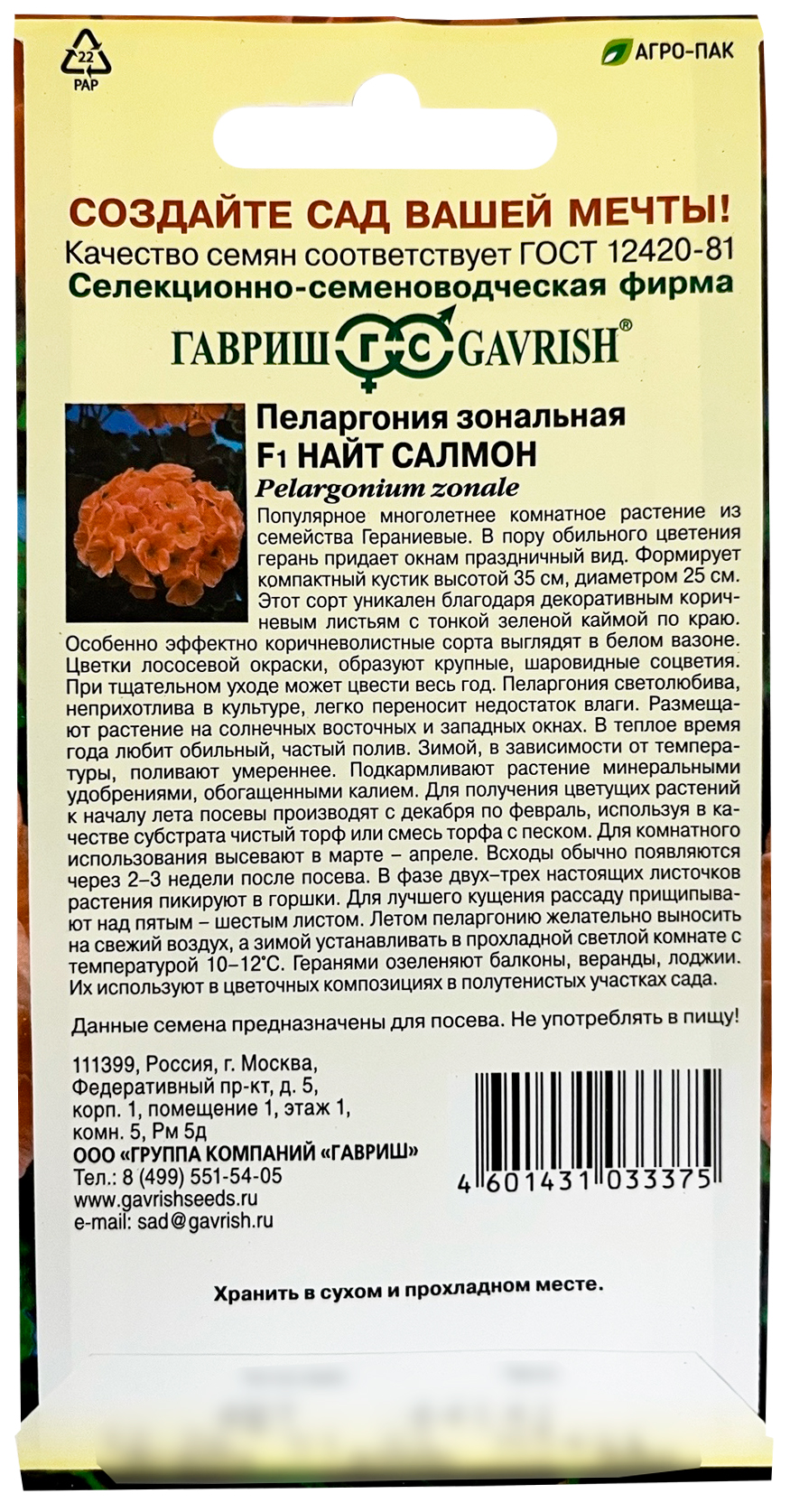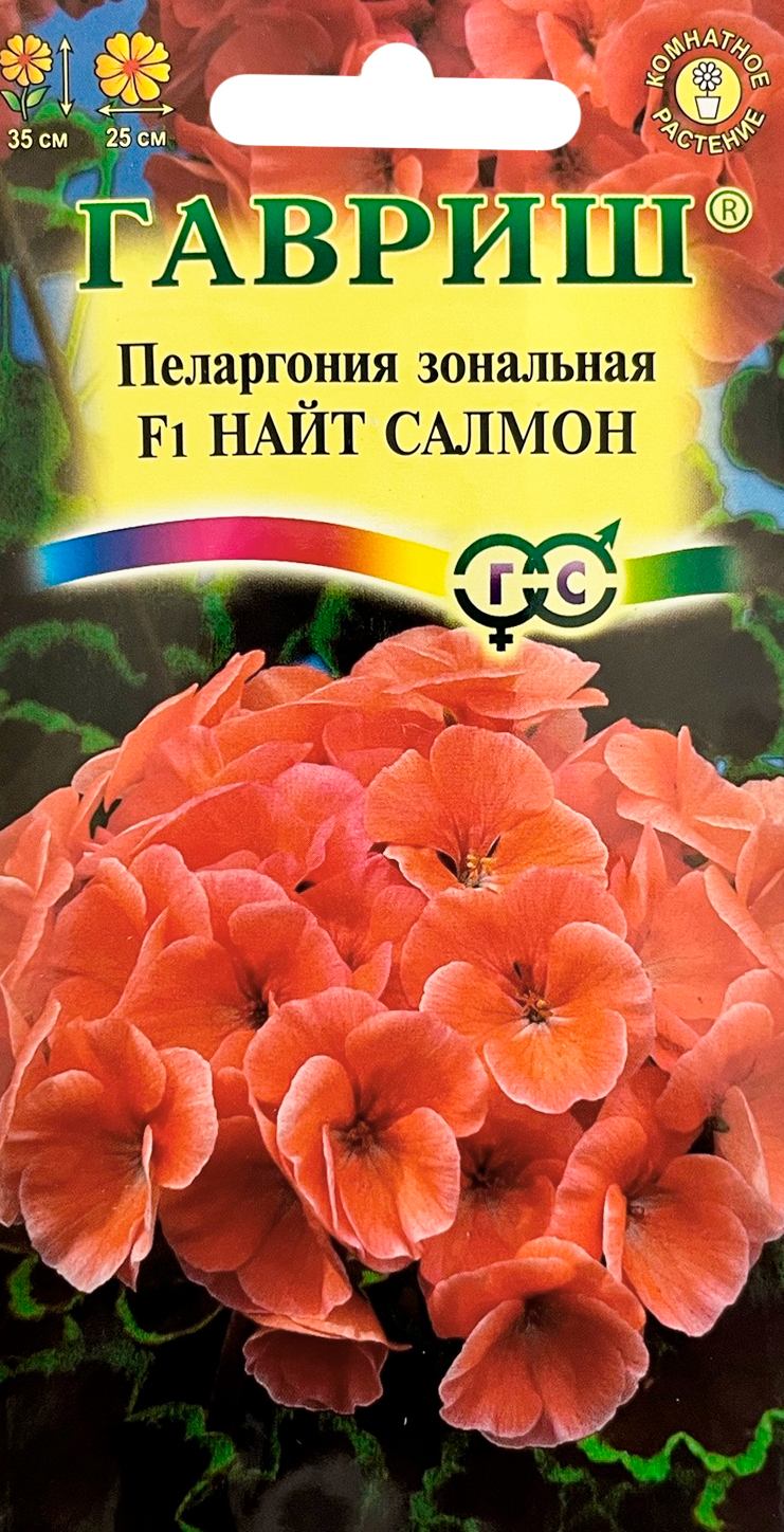 Пеларгония зональная Найт Салмон F1Популярное многолетнее комнатное растение из семейства Гераниевые. В пору обильного цветения герань придает окнам праздничный вид. Формирует объемный и компактный кустик высотой 35 см, диаметром 25 см. Этот сорт уникален благодаря декоративным коричневым листьям с тонкой зеленой каймой по краю. Особенно эффектно коричневолистные сорта выглядят в белой цветочной таре. Цветки лососевой окраски, образуют крупные, шаровидные соцветия. При тщательном уходе может цвести весь год. Пеларгония светолюбива, неприхотлива в культуре, легко переносит недостаток влаги. Размещают растение на солнечных восточных и западных окнах. В теплое время года любит обильный, частый полив. Зимой, в зависимости от температуры, поливают умереннее. Подкармливают растение минеральными удобрениями, обогащенными калием. Для получения цветущих растений к началу лета посевы производят с декабря по февраль, используя в качестве субстрата чистый торф или смесь торфа с песком. Для комнатного использования высевают в марте-апреле. Всходы обычно появляются через 2-3 недели после посева. В фазе двух-трех настоящих листочков растения пикируют в горшки. Для лучшего кущения рассаду прищипывают над пятым - шестым листом. Летом пеларгонию желательно выносить на свежий воздух, а зимой устанавливать в прохладной светлой комнате с температурой 10-12 °C. Геранями озеленяют балконы, веранды, лоджии. Их используют в цветочных композициях в полутенистых участках сада.