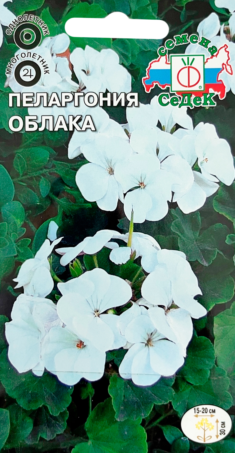 Пеларгония садовая Облака СеДеКТравянистое растение семейства Гераниевых, благодаря содержанию эфирного масла обладает характерным душистым запахом. Куст высотой 30 см, листья округлые, зеленые со слабо выраженной красной окантовкой. Цветки белые, собраны в крупные шаровидные соцветия. Растение светолюбивое, но может расти и в полутени. Для выращивания используют различные смеси дерновой, перегнойной земли и песка, увлажняют умеренно. При хорошем уходе цветение продолжается все лето. Осенью растение пересаживается в горшок и выращивается на светлом месте в комнатных условиях. Для озеленения территории используется в клумбах, рабатках, вазах и подвесных кашпо. Оптимальная для прорастания семян температура почвы 15-20°С.