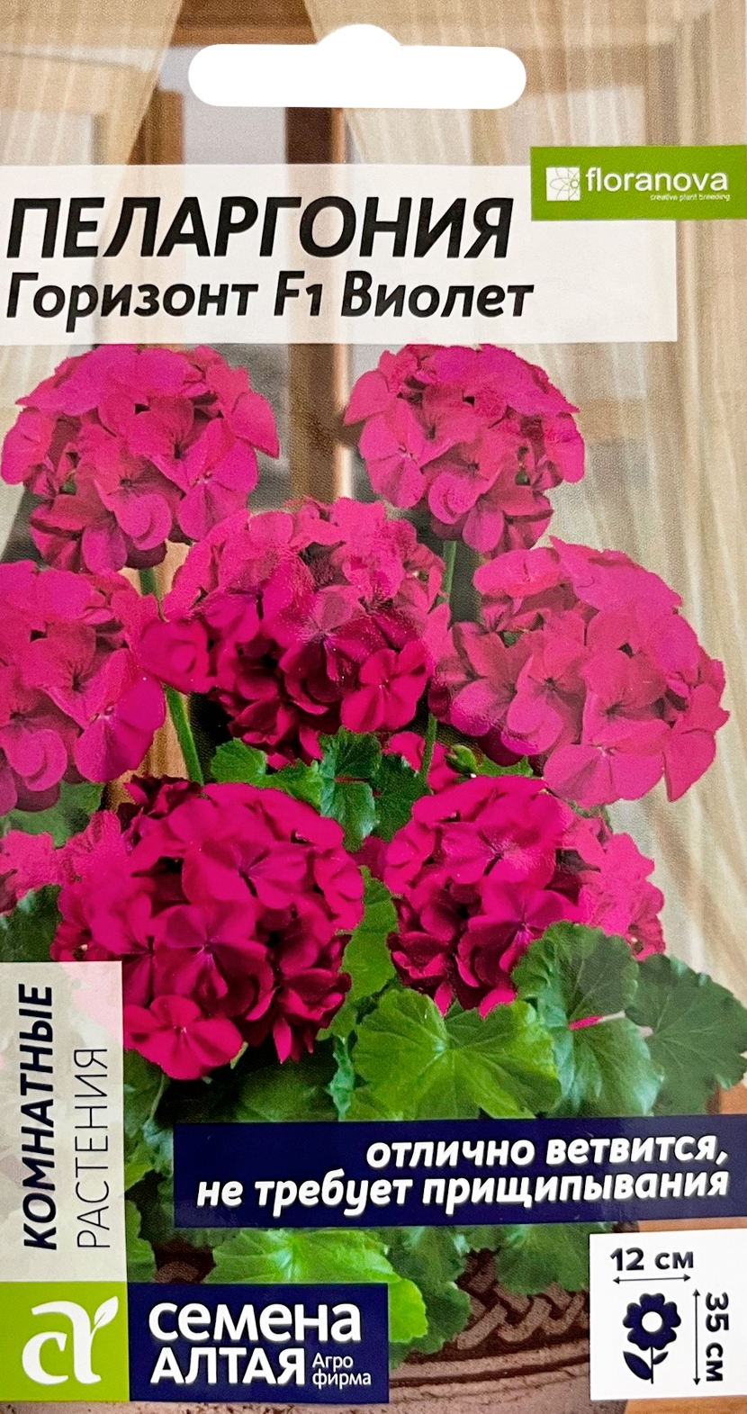 Пеларгония Горизонт F1 зональная ВиолетНе требует прищипывания, формирует хорошо разветвленные плотные кустики с короткими и прочными стеблями. Цветение раннее и обильное, простые крупные цветки собраны в пышные шапки фиолетово-розовых соцветий. Наибольшей декоративности достигает во второй половине лета. Отлично смотрится в массовых посадках, цветочных композициях, можно выращивать в вазонах, балконных ящиках, кашпо. В комнатных условиях выращивается как многолетник, в открытом грунте – в качестве однолетнего растения.