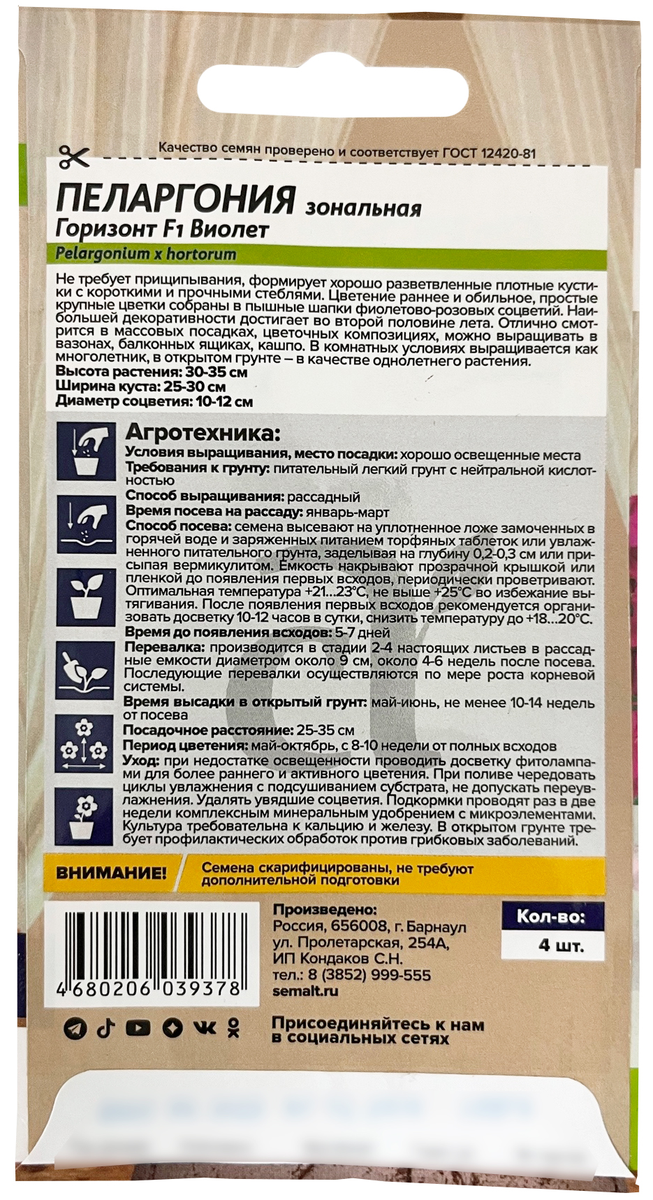 Пеларгония Горизонт F1 зональная Виолет 4шт семена