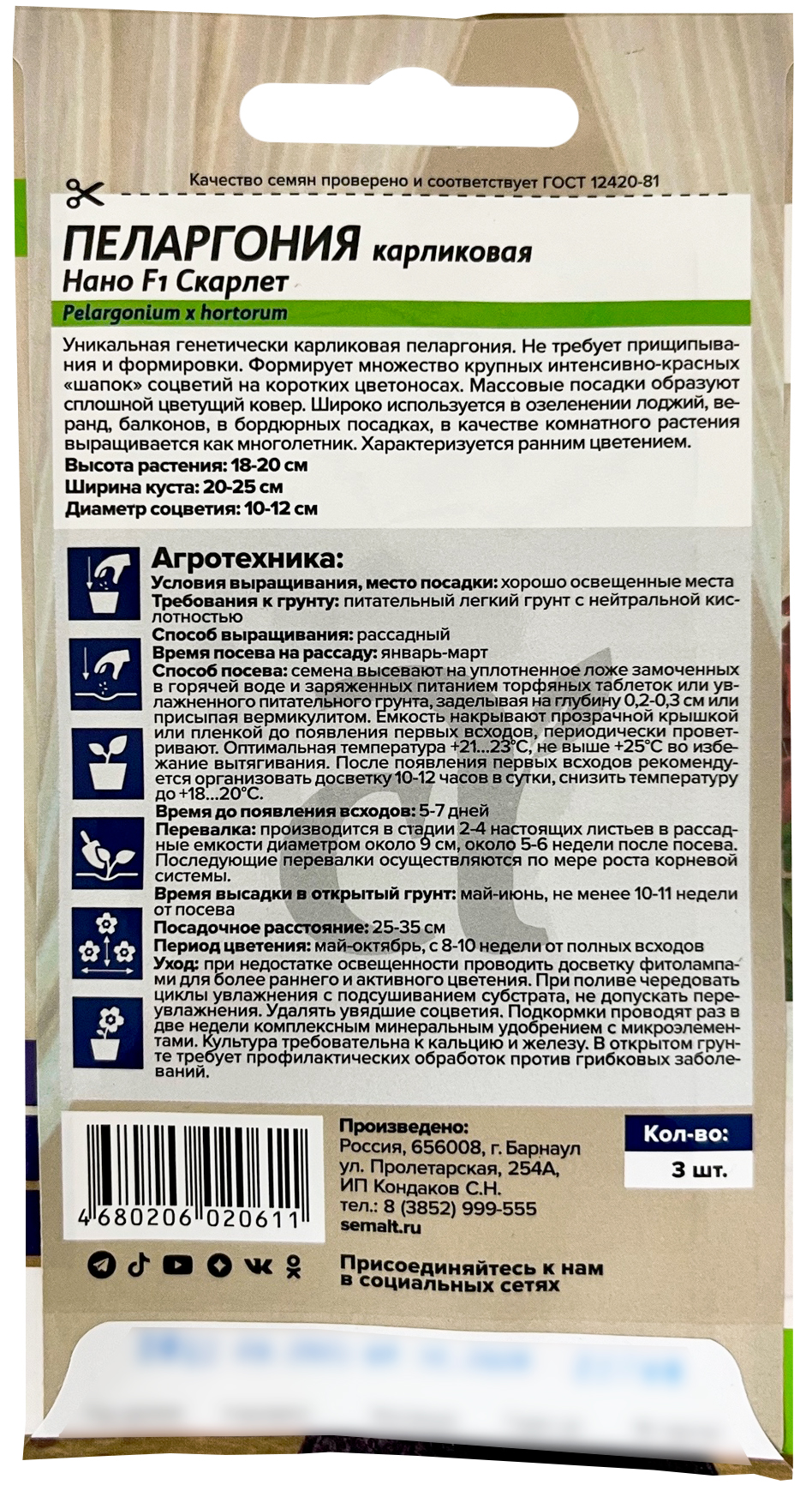 Пеларгония Нано F1 Скарлет 3шт семена