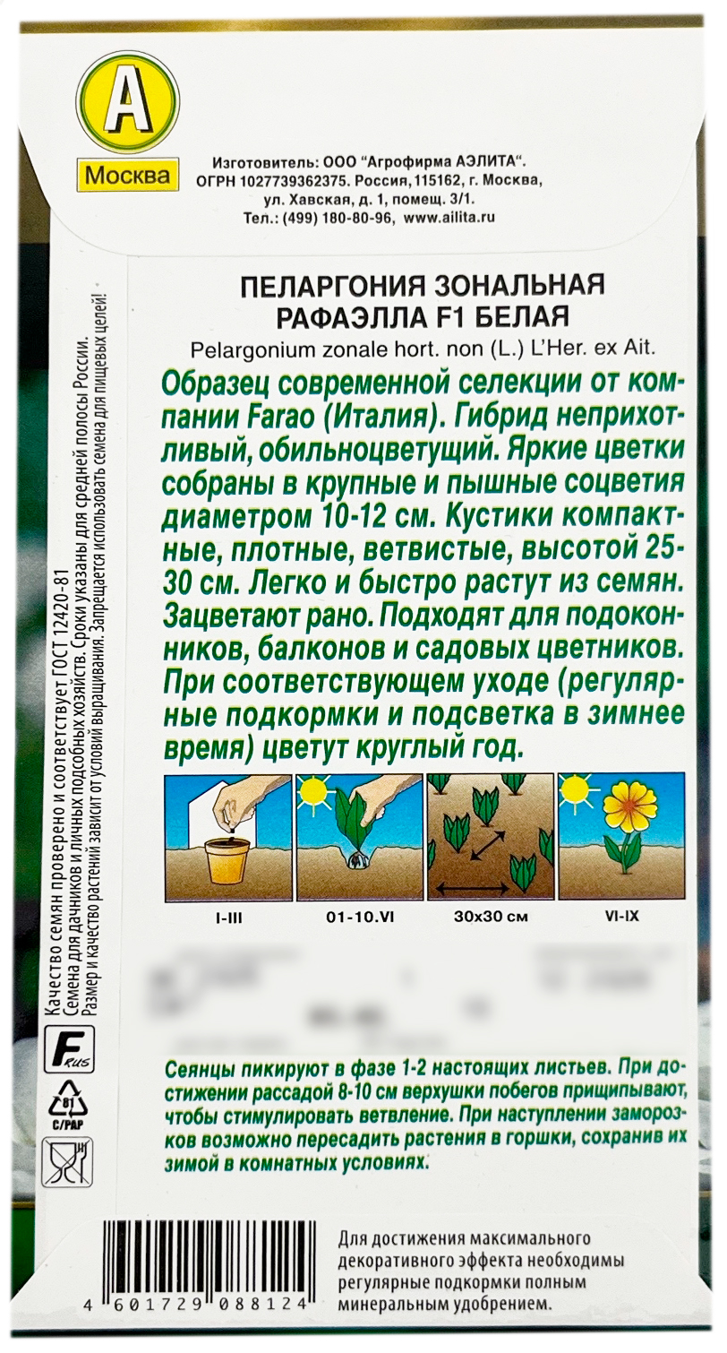 Пеларгония зональная РАФАЭЛЛА F1 БЕЛАЯ АЭЛИТАЯркий обильноцветущий гибрид – образец современной селекции от компании Farao (Италия). Цветки собраны в крупные, пышные соцветия диаметром 10-12 см. Кусты компактные, плотные, ветвистые, высотой 25-30 см. Легко и быстро растут из семян. Зацветают рано. Подходят для подоконников, балконов и садовых цветников. При соответствующем уходе (регулярные подкормки и подсветка в зимнее время) цветут круглый год.