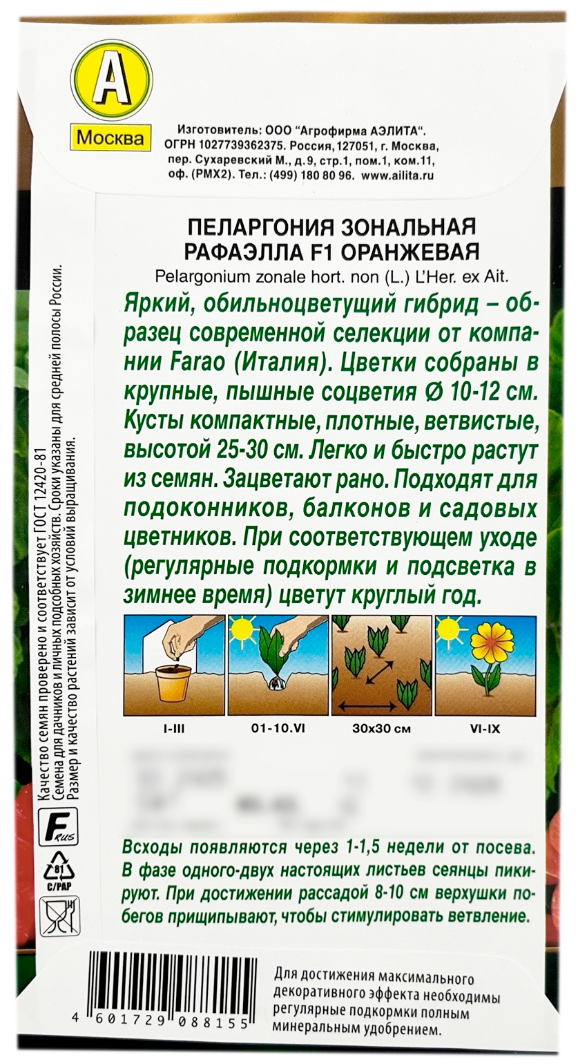 Пеларгония зональная РАФАЭЛЛА F1 ОРАНЖЕВАЯ АЭЛИТАЯркий, обильноцветущий гибрид – образец современной селекции от компании Farao (Италия). Цветки собраны в крупные, пышные соцветия 10-12 см. Кусты компактные, плотные, ветвистые, высотой 25-30 см. Легко и быстро растут из семян. Зацветают рано. Подходят для подоконников, балконов и садовых цветников. При соответствующем уходе (регулярные подкормки и подсветка в зимнее время) цветут круглый год.