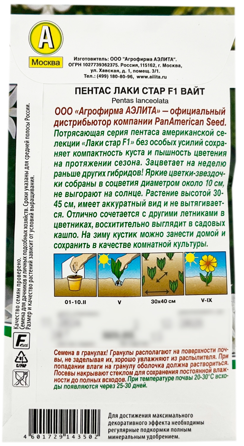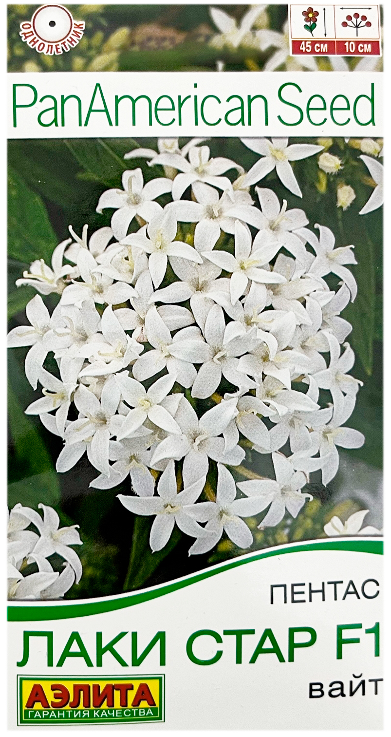 Пентас ЛАКИ СТАР F1 ВАЙТ АЭЛИТАПотрясающая серия пентаса американской селекции «Лаки стар F1» без особых усилий сохраняет компактность куста и пышность цветения на протяжении сезона. Зацветает на неделю раньше других гибридов! Яркие цветки-звездочки собраны в соцветия диаметром около 10 см, не выгорают на солнце. Растение высотой 30-45 см, имеет аккуратный вид и не вытягивается. Отлично сочетается с другими летниками в цветниках, восхитительно выглядит в садовых кашпо. На зиму кустик можно занести домой и сохранить в качестве комнатной культуры.
