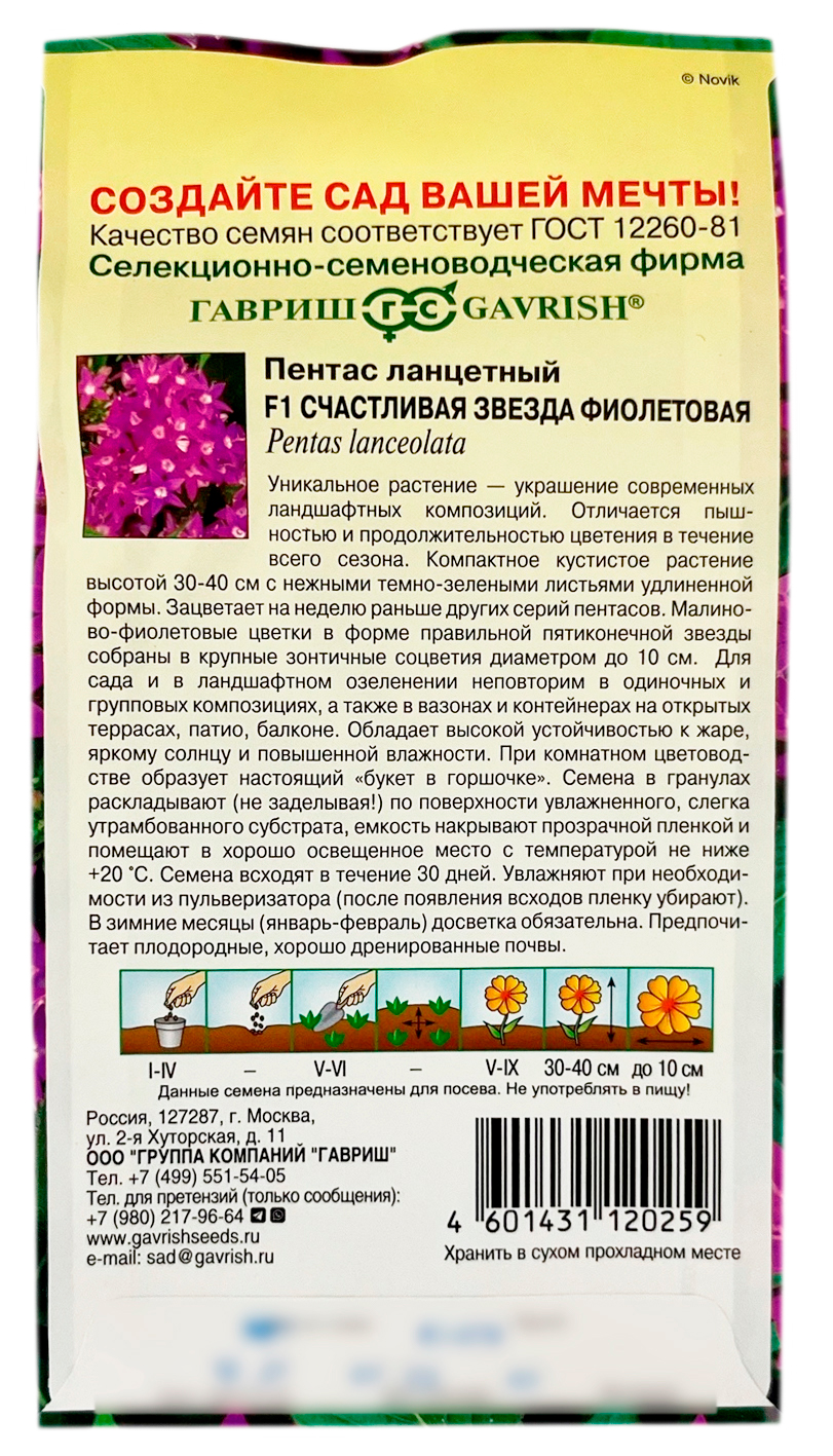 Пентас ланцетный F1 СЧАСТЛИВАЯ ЗВЕЗДА ФИОЛЕТОВАЯ ГАВРИШУникальное растение — украшение современных ландшафтных композиций. Отличается пышностью и продолжительностью цветения в течение всего сезона. Компактное кустистое растение высотой 30-40 см с нежными, темно-зелеными листьями удлиненной формы. Зацветает на неделю раньше других серий пентасов. Фиолетовые цветки в форме правильной пятиконечной звезды собраны в крупные зонтичные соцветия диаметром до 10 см. Для сада и в ландшафтном озеленении неповторим в одиночных и групповых композициях, а также в вазонах и контейнерах на открытых террасах, патио, балконе. Обладает высокой стрессоустойчивостью к жаре, яркому солнцу и повышенной влажности. При комнатном цветоводстве образует настоящий «букет в горшочке». Семена в гранулах раскладывают (не заделывая!) по поверхности увлажненного, слегка утрамбованного субстрата, емкость накрывают прозрачной пленкой и помещают в хорошо освещенное место с температурой не ниже +20°С. Семена всходят в течение 30 дней. Увлажняют при необходимости из пульверизатора (после появления всходов пленку убирают). В зимние месяцы (январь-февраль) досветка обязательна. Предпочитает плодородные, хорошо дренированные почвы.