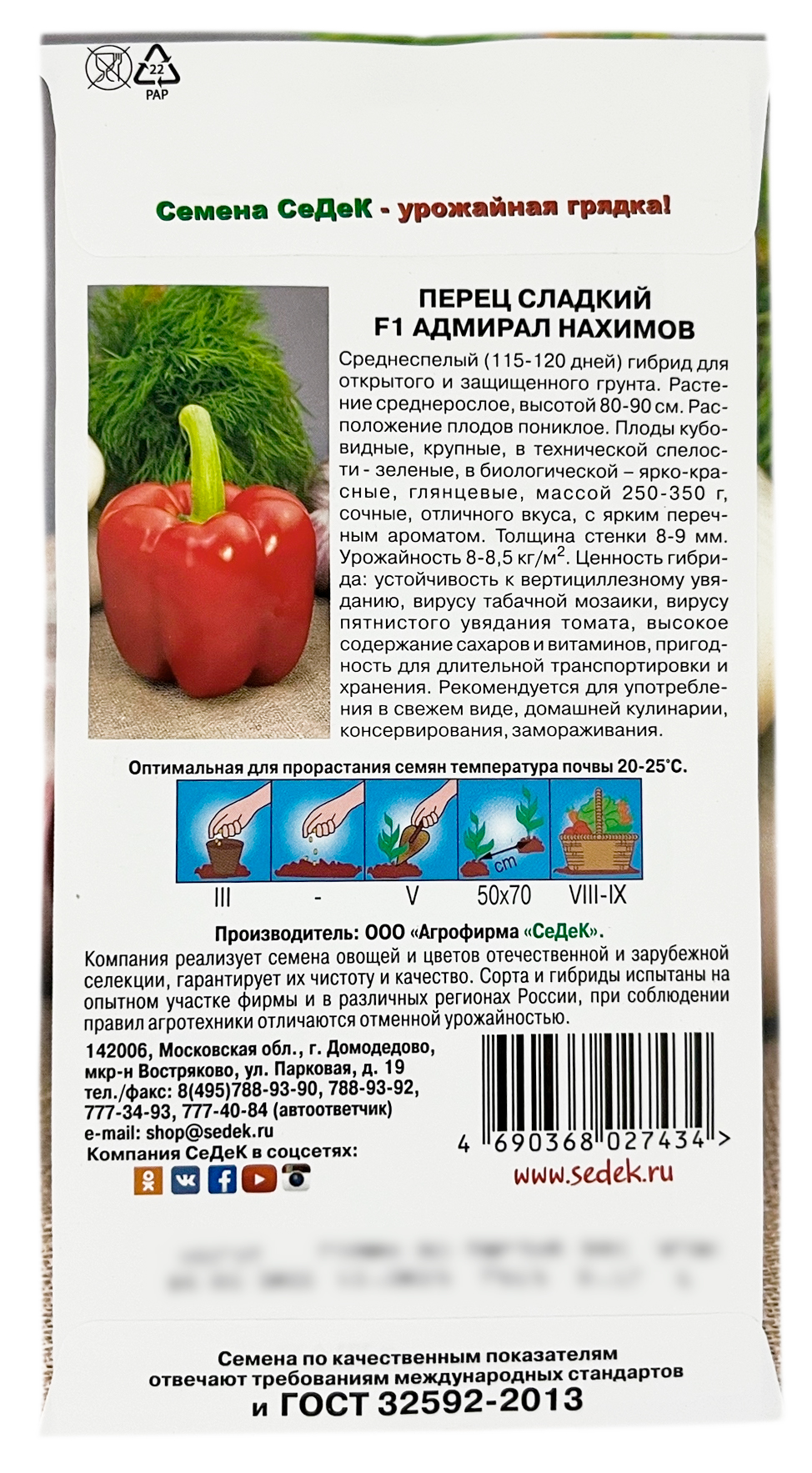 Перец сладкий F1 АДМИРАЛ НАХИМОВ СеДеКСреднеспелый (115-120 дней) гибрид для открытого и защищенного грунта. Растение среднерослое, высотой 80-90 см. Расположение плодов пониклое. Плоды кубовидные, крупные, в технической спелости - зеленые, в биологической – ярко-красные, глянцевые, массой 250-350 г, сочные, отличного вкуса, с ярким перечным ароматом. Толщина стенки 8-9 мм. Урожайность 8-8,5кг/м2. Ценность гибрида: устойчивость к вертициллезному увяданию, вирусу табачной мозаики, вирусу пятнистого увядания томата, высокое содержание сахаров и витаминов, пригодность для длительной транспортировки и хранения. Рекомендуется для употребления в свежем виде, домашней кулинарии, консервирования, замораживания.