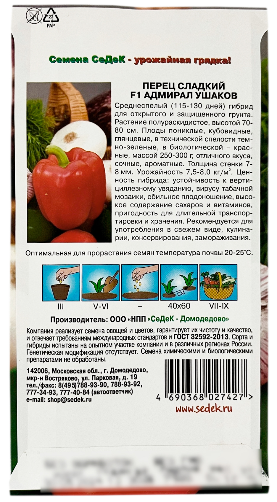 Перец сладкий F1 АДМИРАЛ УШАКОВ СеДеКСреднеспелый (115-130 дней) гибрид для открытого и защищенного грунта. Растение полураскидистое, высотой 70-80 см. Плоды пониклые, кубовидные, глянцевые, в технической спелости темно-зеленые, в биологической – красные, массой 250-300 г, отличного вкуса, сочные, ароматные. Толщина стенки 7-8мм. Урожайность 7,5-8,0 кг/м². Ценность гибрида: устойчивость к вертициллезному увяданию, вирусу табачной мозаики, обильное плодоношение, высокое содержание сахаров и витаминов, пригодность для длительной транспортировки и хранения. Рекомендуется для употребления в свежем виде, кулинарии, консервирования, замораживания.