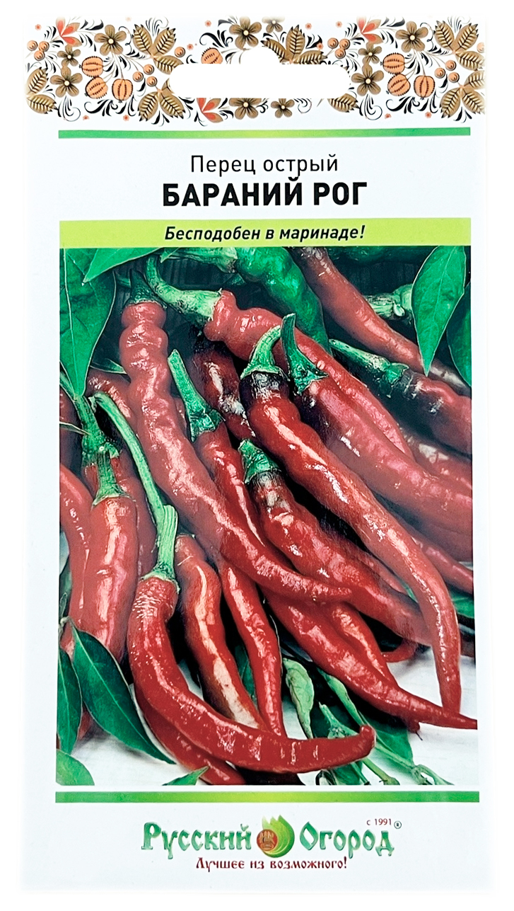Перец острый БАРАНИЙ РОГ Русский ОгородКлассикой острых маринованных закусок является перец Бараний рог. Это раннеспелый сорт, краснеющий к 130-ти суткам после высадки. Одинаково хорошо растет на солнце и в полутени, на огороде и в пленочной теплице. Высота куста внушительная, может достигать полутора метров, однако в формировании растение не нуждается. Культура хорошо переносит переувлажнение. Перчики острые, хоботовидные, слабоморщинистые у плодоножки, длинные (до 25 см) выраженно глянцевые, можно снимать еще в зеленом виде, если нужна пикантная горечь. Это лучший вариант для маринования, как по вкусу, так и по форме, толщине стенок.