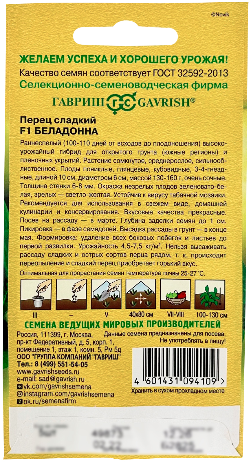 Перец сладкий Беладонна F1 ГАВРИШРаннеспелый (100-110 дней от всходов до плодоношения) высокоурожайный гибрид для открытого грунта и пленочных укрытий. Растение сомкнутое, среднерослое, сильнооблиственное. Плоды пониклые, глянцевые, кубовидные, 3-4-гнездные, длиной 10 см, диаметром 6 см, массой 130-160 г, очень сочные. Толщина стенки 6-8 мм. Окраска незрелых плодов зеленовато-белая, зрелых — светло-желтая. Устойчив к вирусу табачной мозаики. Рекомендуется для использования в свежем виде, домашней кулинарии и консервирования. Вкусовые качества прекрасные. Посев на рассаду — в марте. Пикировка — в фазе семядолей. Высадка рассады в грунт — в конце мая. Формировка: удаление всех боковых побегов и листьев до первой развилки. Урожайность 4,5-7,5 кг/м2.