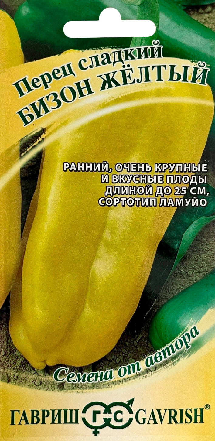 Перец сладкий Бизон желтыйРаннеспелый (93-104 дня от всходов до технической спелости) сорт суперурожайного крупноплодного перца. Рекомендуется для выращивания в открытом грунте (южные регионы) и в теплицах. Растение мощное, высотой 90-100 см. Куст полностью усыпан удлиненноконусовидными глянцевыми плодами, длина которых действительно впечатляет (отдельные до 25 см!). Масса 200 г. Стенки сочные, сладкие, толщиной 4-5мм, остаются необыкновенно нежными как у незрелых зеленых плодов, так и у зрелых ярко-желтых. Сорт очень хорош для свежих салатов, жарки, тушения и фарширования. Продолжительное плодоношение обеспечит регулярный сбор плодов вплоть до поздней осени. Урожайность до 10 кг/м2.