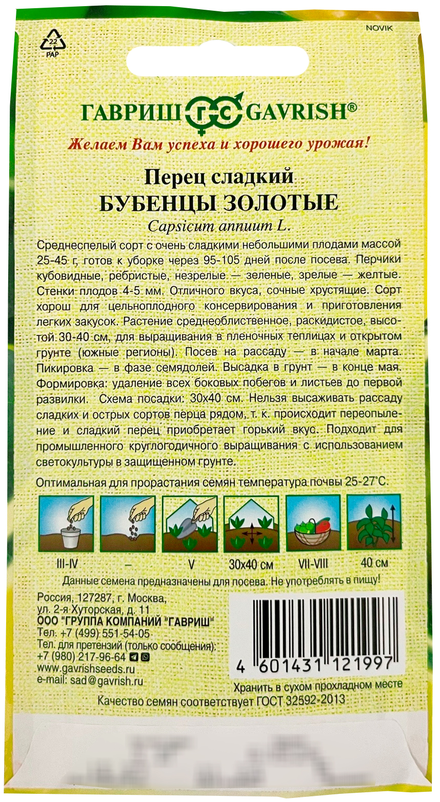 Перец сладкий БУБЕНЦЫ ЗОЛОТЫЕ ГАВРИШСреднеспелый сорт с очень сладкими небольшими плодами массой 25-45 г, готов к уборке через 95-105 дней после посева. Перчики кубовидные, со средней ребристостью, незрелые — зеленые, зрелые — желтые. Стенки плодов 4-5 мм. Отличного вкуса, сочные хрустящие. Сорт хорош для цельноплодного консервирования и приготовления легких закусок. Растение среднеоблиственное, раскидистое, высотой 30-40 см, для выращивания в пленочных теплицах и отрытом грунте (южные регионы). Посев на рассаду — в начале марта. Глубина заделки семян до 1 см. Пикировка — в фазе семядолей. Высадка — в грунт в конце мая. Формировка: удаление всех боковых побегов и листьев до первой развилки. Схема посадки: 30x40 см. Нельзя высаживать рассаду сладких и острых сортов перца рядом, т.к. происходит переопыление и сладкий перец приобретает горький вкус. Подходит для промышленного круглогодичного выращивания с использованием светокультуры в защищенном грунте.