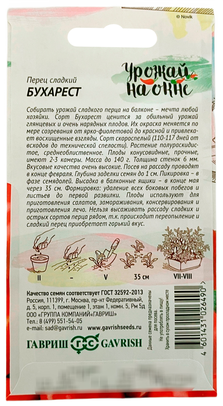 Перец сладкий Бухарест Урожай на окнеСкороспелый (110-117 дней от всходов до технической спелости) сорт. Рекомендован для выращивания на приусадебных участках и в пленочных теплицах. Растение высотой до 1,1 м полураскидистое, среднеоблиственное. Плоды конусовидной формы, прочные, поверхность гладкая, глянцевая, имеют 2-3 камеры. Масса до 140 г. Толщина стенок 6 мм. Окраска плодов в технической спелости фиолетовая, в биологической - красная. Плоды высоких вкусовых качеств, отлично подойдут для приготовления салатов, замораживания, консервирования и приготовления лечо. Урожайность 4,1 кг\м2.