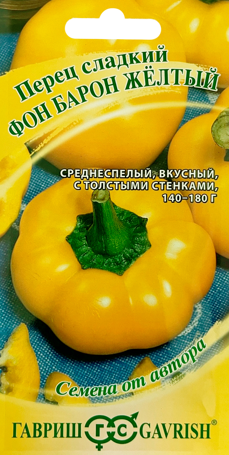 Перец Фон Барон желтыйЭффектный сорт типа «Ротунда» с отличными вкусовыми качествами. Рекомендуется для выращивания в открытом грунте и пленочных теплицах. Растение компактное, среднеоблиственное, с короткими междоузлиями, 60-80 см высотой, начинает обильно плодоносить через 110-115 дней. Плоды массой 180 г, имеют форму маленькой тыквы, с очень толстыми (8-10 мм) «дольными» стенками. Окраска незрелых перцев зеленая, зрелых — желтая. Плоды используют для красивой сладкой нарезки, порционной подачи салатов или мяса (служит в качестве емкости), фарширования, запекания и консервирования. Сорт неприхотлив, легко переносит кратковременные понижения температуры. Посев на рассаду — в конце февраля. Пикировка — в фазе семядолей. Высадка рассады в грунт — в конце мая. Формировка: удаление всех боковых побегов и листьев до первой развилки. Схема посадки: 40x60 см.