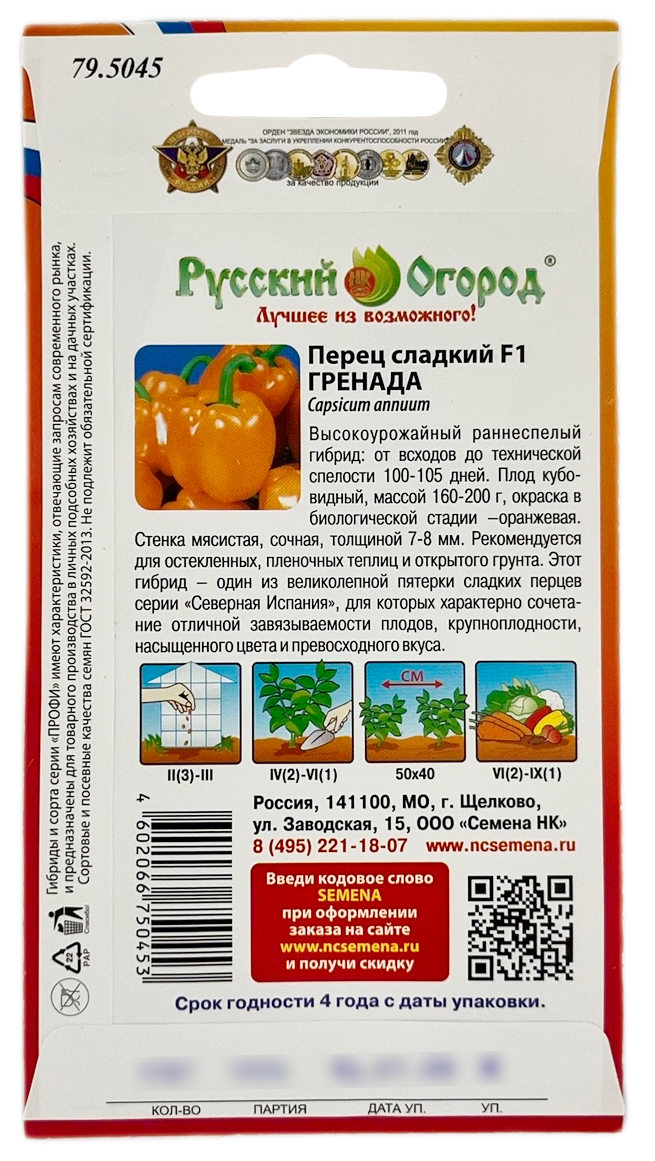 Перец сладкий ГРЕНАДА Русский ОгородШикарный раннеспелый перец-аристократ! Один из пяти сладких перцев-грандов серии "Северная Испания", отличающихся крупноплодностью, высокой завязываемостью плодов, и замечательным вкусом! От всходов до технической спелости - 100-105 дней. Масса золотисто-оранжевого кубовидного плода с мясистыми, сочными стенками толщиной 7-8 мм, 160-200 г. Гибрид подходит для выращивания в открытом и закрытом грунте, отличается дружной отдачей урожая.