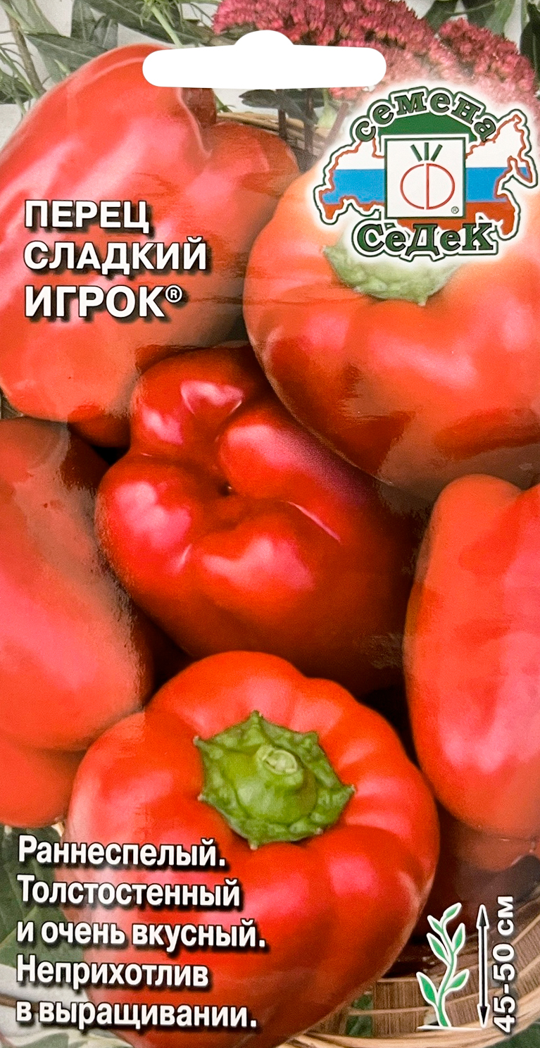 Перец сладкий ИгрокРаннеспелый (100-105 дней) высокоурожайный сорт для теплиц, тоннелей, открытого грунта. Растение полураскидистое, среднерослое, высотой 45-50 см. Плоды пониклые, крупные, кубовидные, среднеребристые, глянцевые, в технической спелости светло-зеленые, в биологической – насыщенно-красные, массой 130-150 г, толщина стенки 9-12 мм. Вкусовые качества очень высокие. Урожайность 5-6 кг/м²,. Ценность сорта: устойчивость к неблагоприятным условиям выращивания и изменениям температуры, обильное плодоношение, дружная отдача раннего урожая. Рекомендуется для употребления в свежем виде и консервирования, один из лучших сортов для фаршировки.