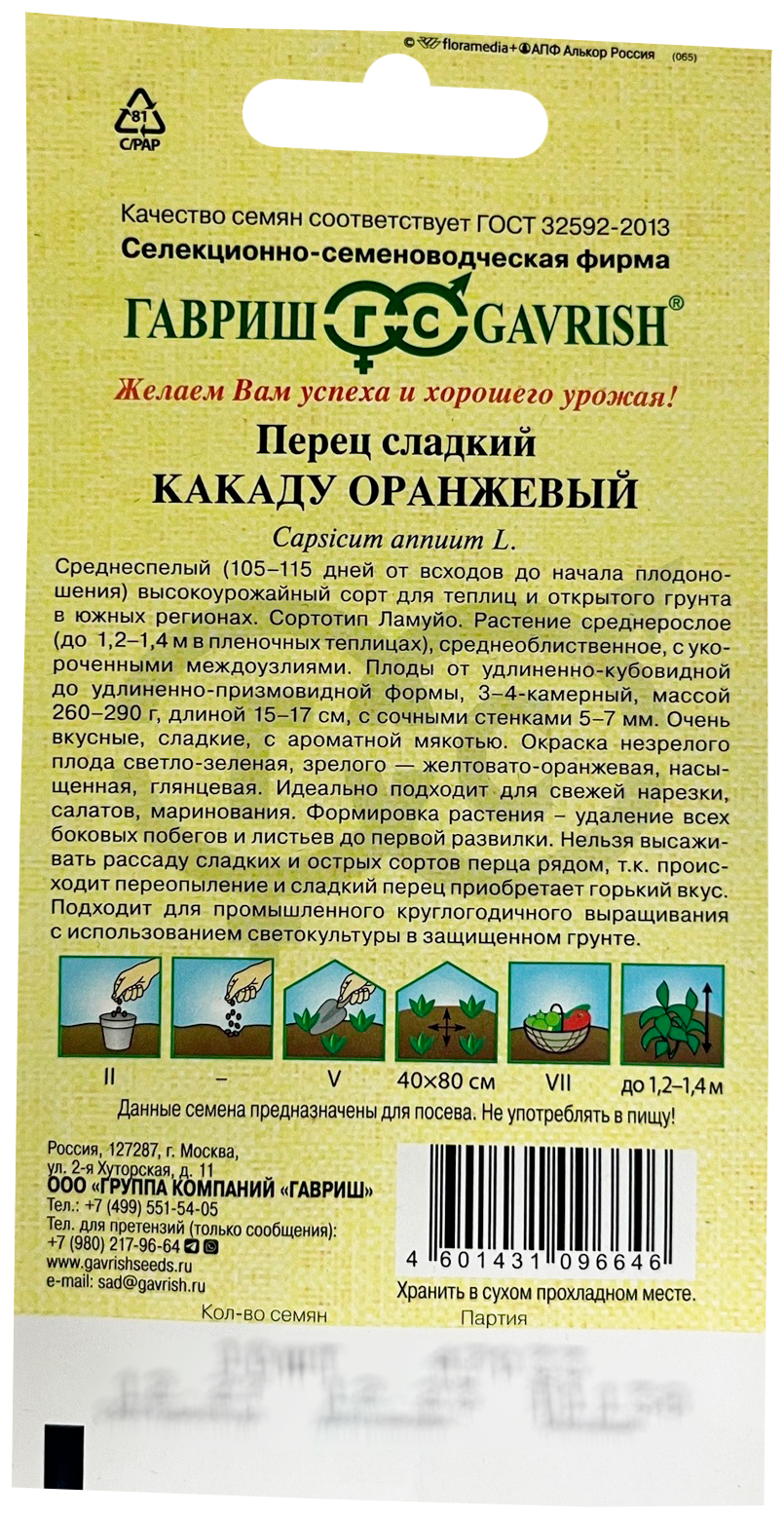 Перец сладкий Какаду оранжевыйСреднеспелый (105-115 дней от всходов до начала плодоношения) высокоурожайный сорт для теплиц и открытого грунта в южных регионах. Растение среднерослое (до 1,2-1,4 м в пленочных теплицах), среднеоблиственное, с укороченными междоузлиями. Плоды от удлиненно-кубовидной до удлиненнопризмовидной формы, 3-4-камерныи, массой 260-290 г, длиной 15-17 см, с сочными стенками 5-7 мм. Очень вкусные, сладкие, с ароматной мякотью. Окраска незрелого плода светло-зеленая, зрелого — желтовато-оранжевая, насыщенная, глянцевая. Идеально подходит для свежей нарезки, салатов, маринования. Посев на рассаду в конце февраля. Пикировка — в фазе семядолей Высадка в грунт — в конце мая. Формировка: удаление всех боковых побегов и листьев до первой развилки. Схема посадки: 40x80 см.