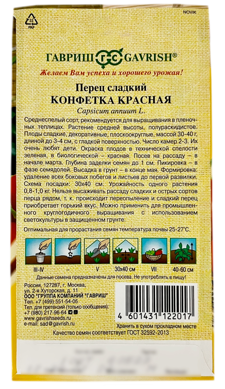 Перец сладкий КОНФЕТКА КРАСНАЯ ГАВРИШСреднеспелый сорт рекомендуется для выращивания в пленочных теплицах. Растение средней высоты полураскидистое. Плоды сладкие, декоративные, плоскоокруглые массой 30-40 г, длиной до 3-4 см с гладкой поверхностью. Число камер 2-3. Их очень любят дети. Окраска плодов в технической спелости – зеленая, в биологической – красная. Посев на рассаду в начале марта. Глубина заделки семян до 1 см. Пикировка в фазе семядолей. Высадка в грунт в конце мая. Формировка: удаление всех боковых побегов и листьев до первой развилки. Схема посадки 30x40 см. Урожайность одного растения 0,8-1,0 кг. Нельзя высаживать рассаду сладких и острых сортов перца рядом, т.к. происходит переопыление и сладкий перец приобретает горький вкус. Подходит для промышленного круглогодичного выращивания с использованием светокультуры в защищенном грунте.