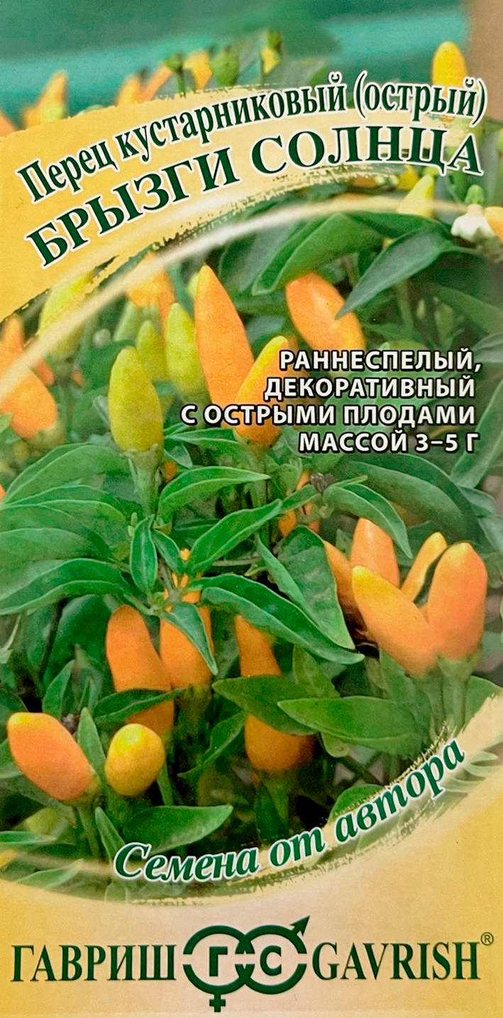 Перец кустарниковый острый БРЫЗГИ СОЛНЦА ГАВРИШРаннеспелый сорт. Растение облиственное, с очень короткими межоузлиями, штамбовое и очень сильным ветвлением, высотой 25-35 см. Плод конусовидный, гладкий, одиночный, расположен вертикально вверх. Масса плода 3-5 г. Окраска плода в технической спелости желтовато-белая, в биологической желтая, глянцевость средняя. Стенка толщиной 1 мм. Длина плода 2 см, диаметр 0,5-1 см. Предназначен для декоративных целей и для употребления в свежем виде. Подходит для выращивания в открытом грунте, пленочных теплицах, в горшках на балконе и в комнатных условиях. Вкус очень острый. Посев на рассаду — конец февраля начало марта. Глубина заделки семян 0,5 см. Высадка рассады — в конце мая. Пикировка в фазе 1-2-х настоящих листьев. Нельзя высаживать рассаду сладких и острых сортов перца рядом, т.к. происходит переопыление и сладкий перец приобретает горький вкус.