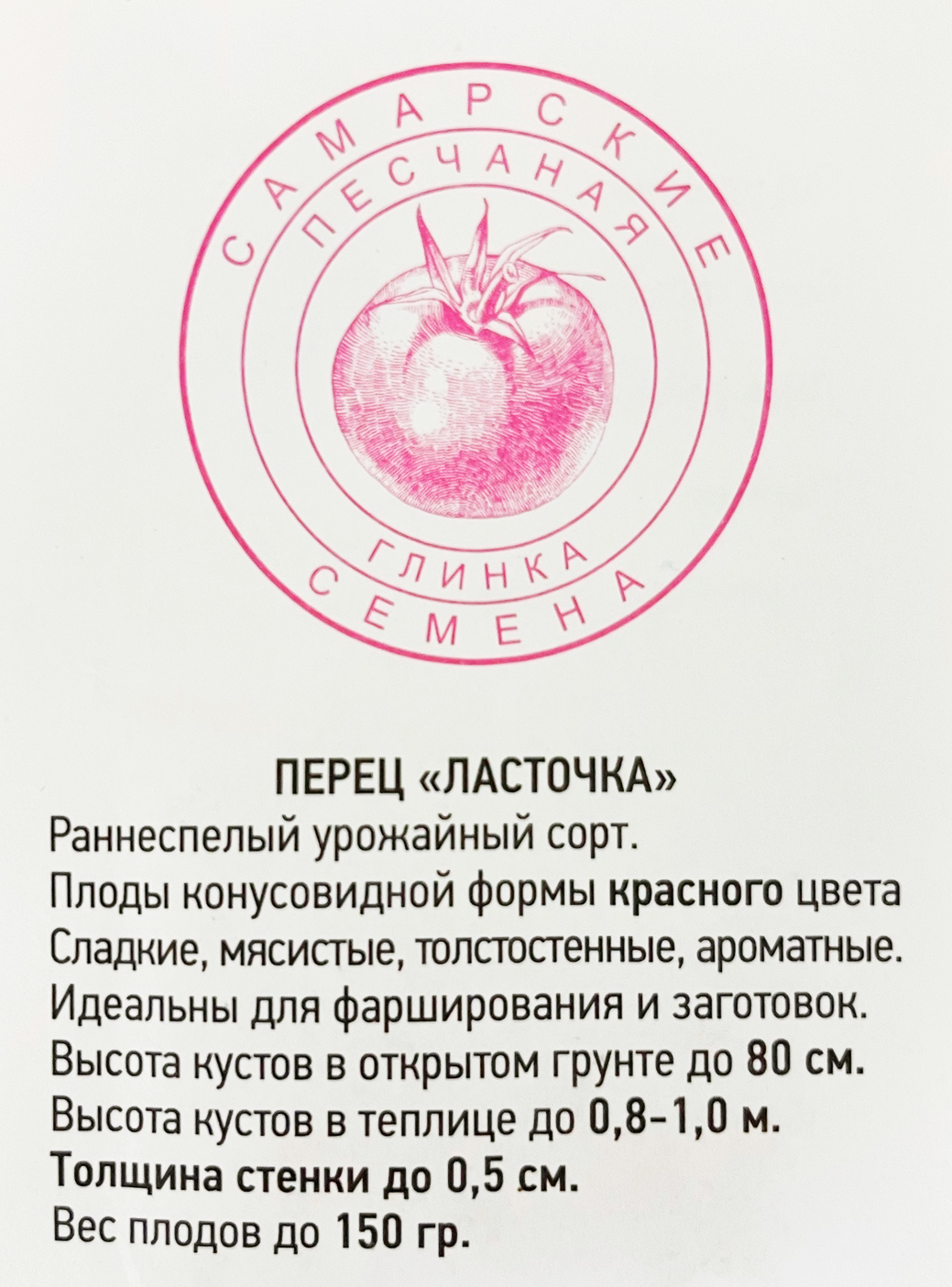 Перец ЛасточкаСорт "Ласточка"- сорт раннеспелый (105 – 115 дней). Растение высотой до 60 см., полураскидистое. Плоды красные, конусовидной формы, гладкие, массой до 100-150 грамм, толщина стенки - 0,5 см. Вкусовые качества отличные. Предназначен для выращивания в открытом грунте и под пленочным укрытием. Идеален для фарширования.
