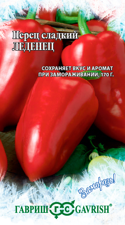 Перец Леденец 0,1 г серия Заморозь! (Capsicum annuum L.)Среднеспелый (113-125 дней) урожайный сорт. Рекомендован для выращивания на приусадебных участках и в пленочных теплицах. Растение полураскидистое, хорошо облиственное, высотой 60-65 см. Плоды выравненные, конусовидные с тупым кончиком, слегка ребристые, очень крупные, транспортабельные. Масса до 150-170 г. Толщина стенок 5-5,5 мм. Окраска плодов в технической спелости светло-зеленая, в биологической - красная. Сорт устойчив к вершинной гнили, вертициллезному увяданию, мозаике. Плоды отлично подходят для замораживания, при длительном хранении в морозильной камере сохраняют аромат.