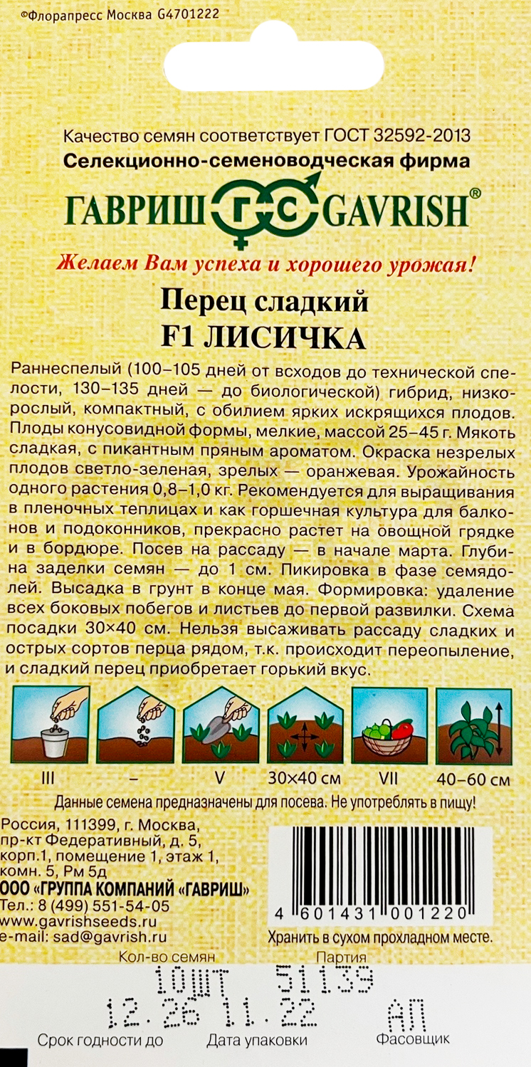 Перец Лисичка оранжевая 10 шт. автор. Н18аннеспелый (100-105 дней от всходов до технической спелости, 130-135 дней — до биологической) гибрид. Растение низкорослое, компактное, с обилием ярких плодов конусовидной формы, мелкие, массой 25-45 г. Мякоть сладкая, вкусная, с пряным ароматом. Окраска незрелых плодов светло-зеленая, зрелых — оранжевая. Урожайность одного растения 0,8-1,0 кг. Рекомендуется для выращивания в пленочных теплицах и как горшечная культура для балконов и подоконников, прекрасно растет на овощной грядке и в бордюре. Посев на рассаду — в начале марта. Глубина заделки семян — до 1 см. Пикировка в фазе семядолей. Высадка в грунт в конце мая. Формировка: удаление всех боковых побегов и листьев до первой развилки. Схема посадки: 30х40 см.