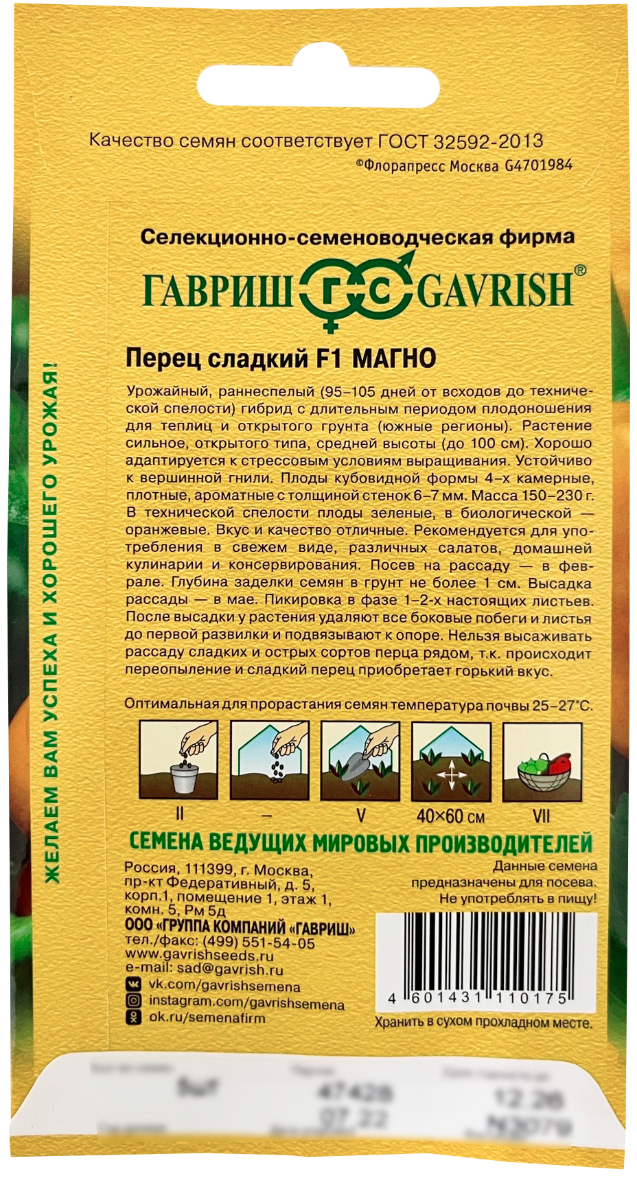 Перец сладкий Магно F1Урожайный, раннеспелый (95-105 дней от всходов до технической спелости) гибрид с длительным периодом плодоношения для теплиц и открытого грунта (южные регионы). Растение сильное, открытого типа, средней высоты (до 100 см). Хорошо адаптируется к стрессовым условиям выращивания. Устойчиво к вершинной гнили. Плоды кубовидной формы 4-х камерные, плотные, ароматные с толщиной стенок 6-7 мм. Масса 150-230 г. В технической спелости плоды зеленые, в биологической – оранжевые. Вкус и качество отличные. Рекомендуется для употребления в свежем виде, различных салатов, домашней кулинарии и консервирования. Посев на рассаду — в феврале. Глубина заделки семян в грунт не более 1 см. Высадка рассады — в мае. Пикировка в фазе 1-2-х настоящих листьев. После высадки у растения удаляют все боковые побеги и листья до первой развилки и подвязывают к опоре. Нельзя высаживать рассаду сладких и острых сортов перца рядом, т.к. происходит переопыление и сладкий перец приобретает горький вкус.