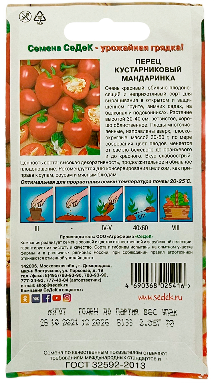 Перец МандаринкаОчень красивый, обильно плодоносящий и неприхотливый сорт для выращивания в открытом и защищённом грунте, зимних садах, на балконах и подоконниках. Растение высотой 30-40 см, ветвистое, хорошо облиственное. Плоды многочисленные, направлены вверх, плоскоокруглые, массой 30-50 г, по мере созревания цвет плодов меняется от светло-бежевого до оранжевого, и до красного. Вкус слабо острый. Ценность сорта: высокая декоративность, продолжительное и обильное плодоношение. Рекомендуется для консервирования целиком, как приправа к супам, соусам и мясным блюдам.