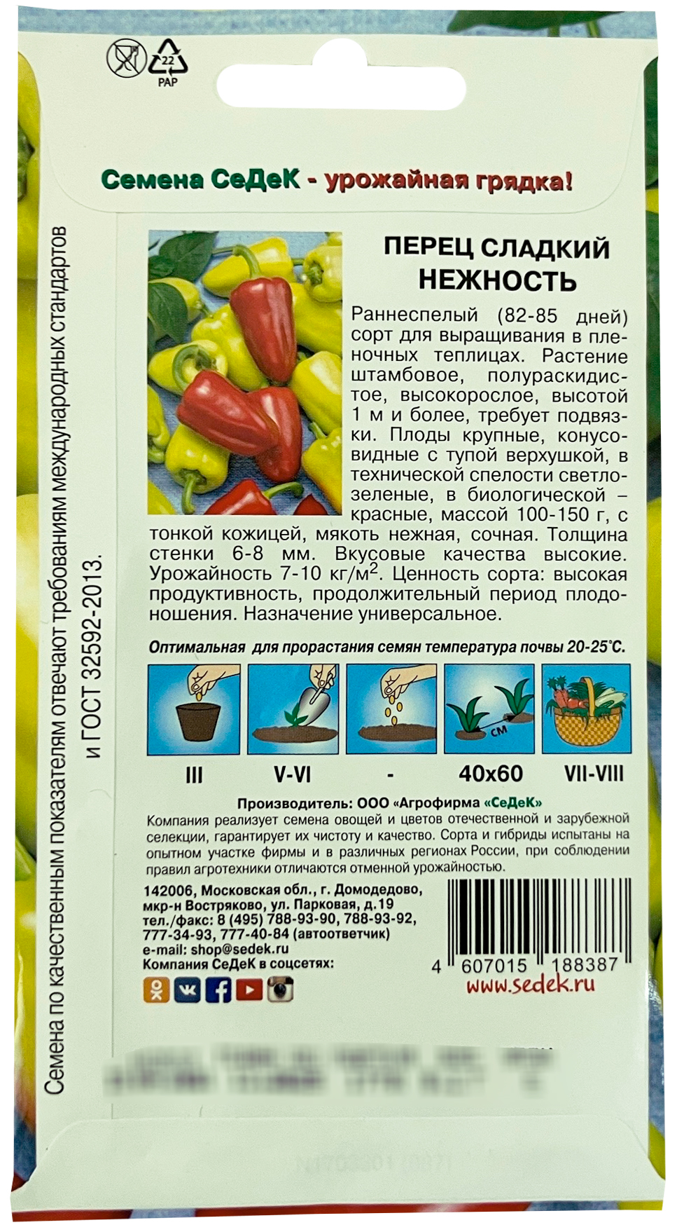 Перец сладкий НЕЖНОСТЬ СеДеКРаннеспелый (82-85 дней) сорт для выращивания в пленочных теплицах. Растение штамбовое, полураскидистое, высокорослое, высотой 1 м и более, требует подвязки. Плоды крупные, конусовидные с тупой верхушкой, в технической спелости светло-зеленые, в биологической – красные, массой 100-150 г, с тонкой кожицей, мякоть нежная, сочная. Толщина стенки 6-8 мм. Вкусовые качества высокие. Ценность сорта: высокая продуктивность, продолжительный период плодоношения. Назначение универсальное.